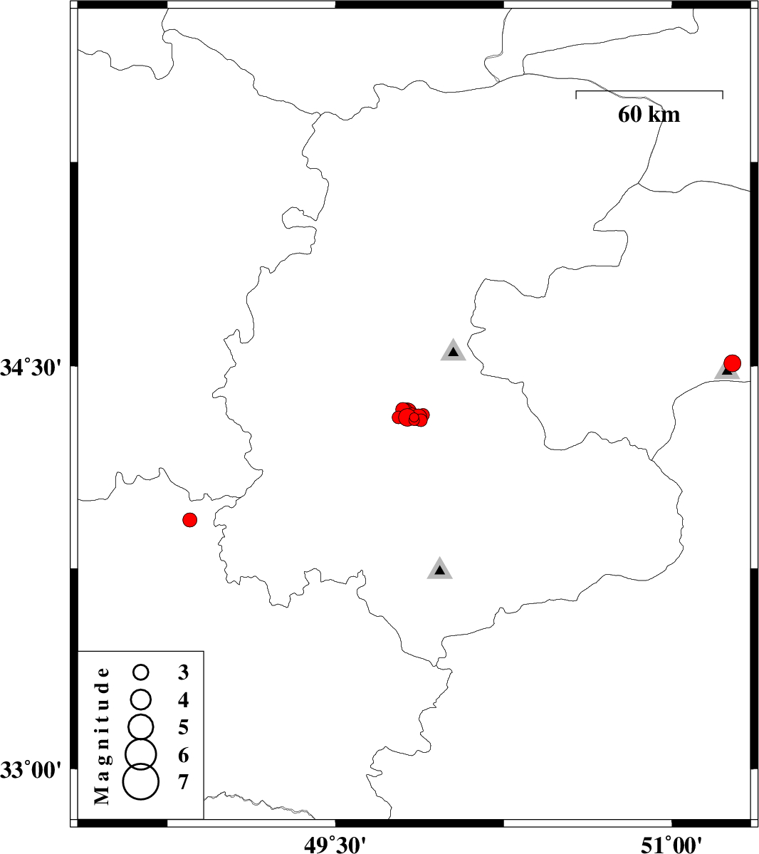 | 2012/01/30 | 10:41:49.5 | 14:11:49.5 | 34.33 | 49.82 | 15 | ML3.7 | Markazi Province, 27 km South-West of Ashtiyan |