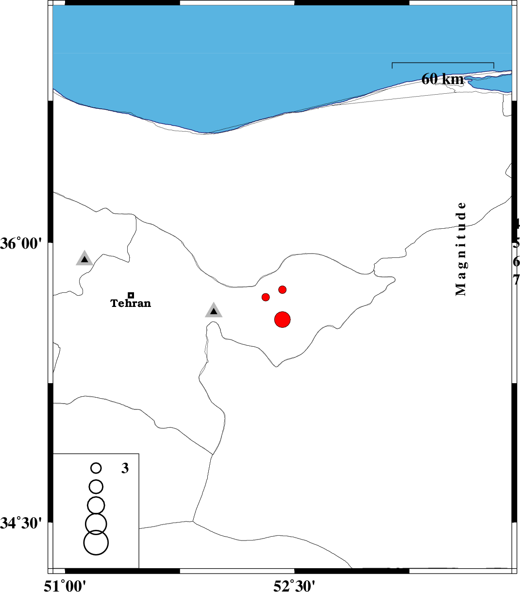 | 2012/02/10 | 11:42:58.4 | 15:12:58.4 | 35.71 | 52.31 | 18 | ML2.3 | Tehran Province, 21 km East of Damavand | ||