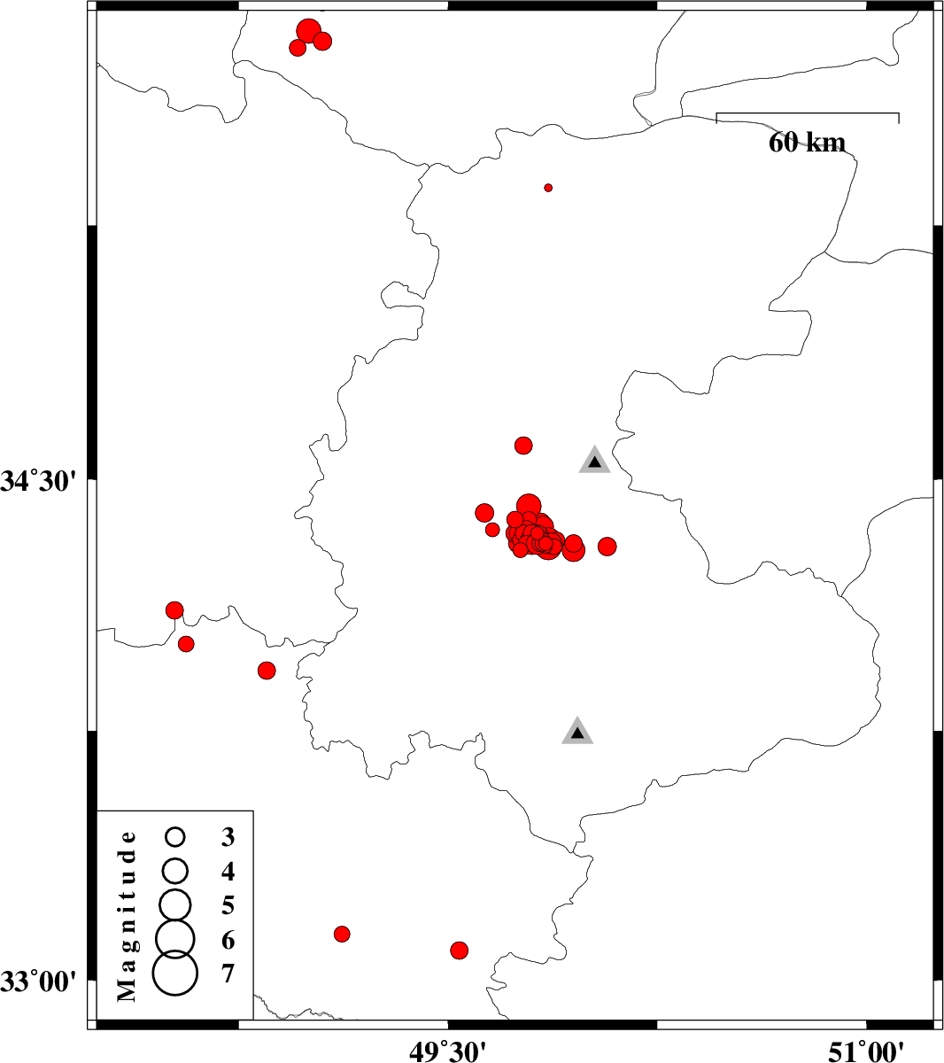 | 2012/01/20 | 03:42:15.2 | 07:12:15.2 | 34.34 | 49.76 | 14 | ML3 | Markazi Province, 29 km North of Arak | ||