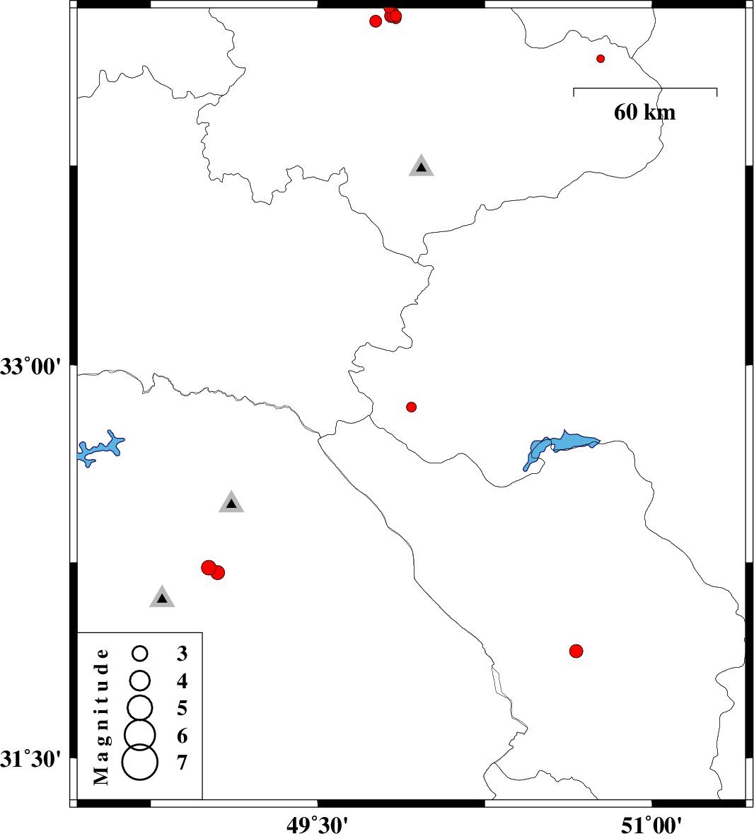 | 2012/02/06 | 15:59:47.8 | 19:29:47.8 | 34.31 | 49.85 | 11 | ML1.9 | Markazi Province, 28 km South-West of Ashtiyan | ||
