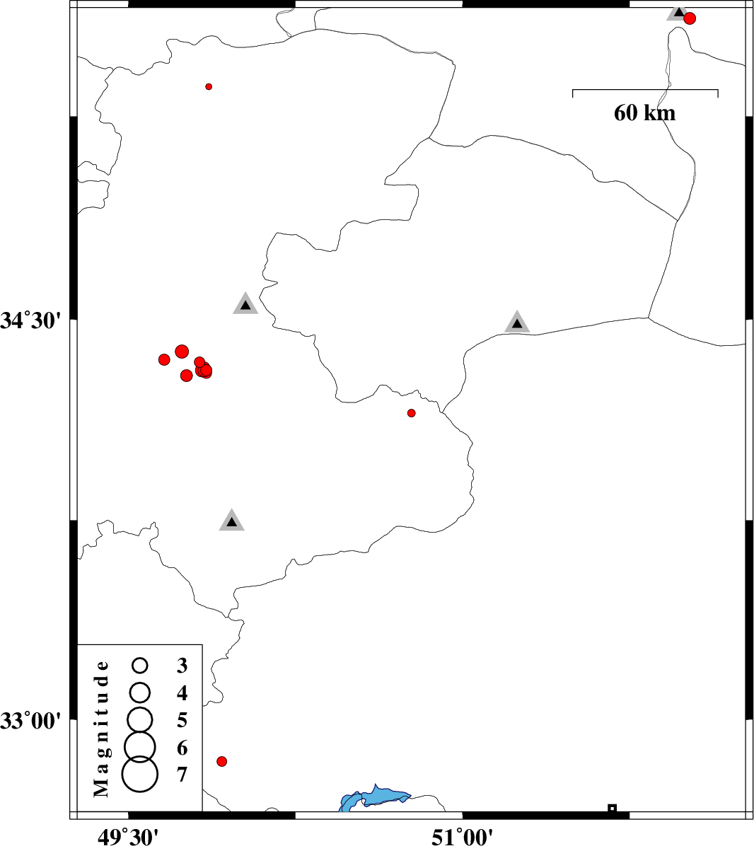| 2012/02/07 | 09:29:01.8 | 12:59:01.8 | 34.31 | 49.84 | 9 | ML2.5 | Markazi Province, 28 km South-West of Ashtiyan | ||
