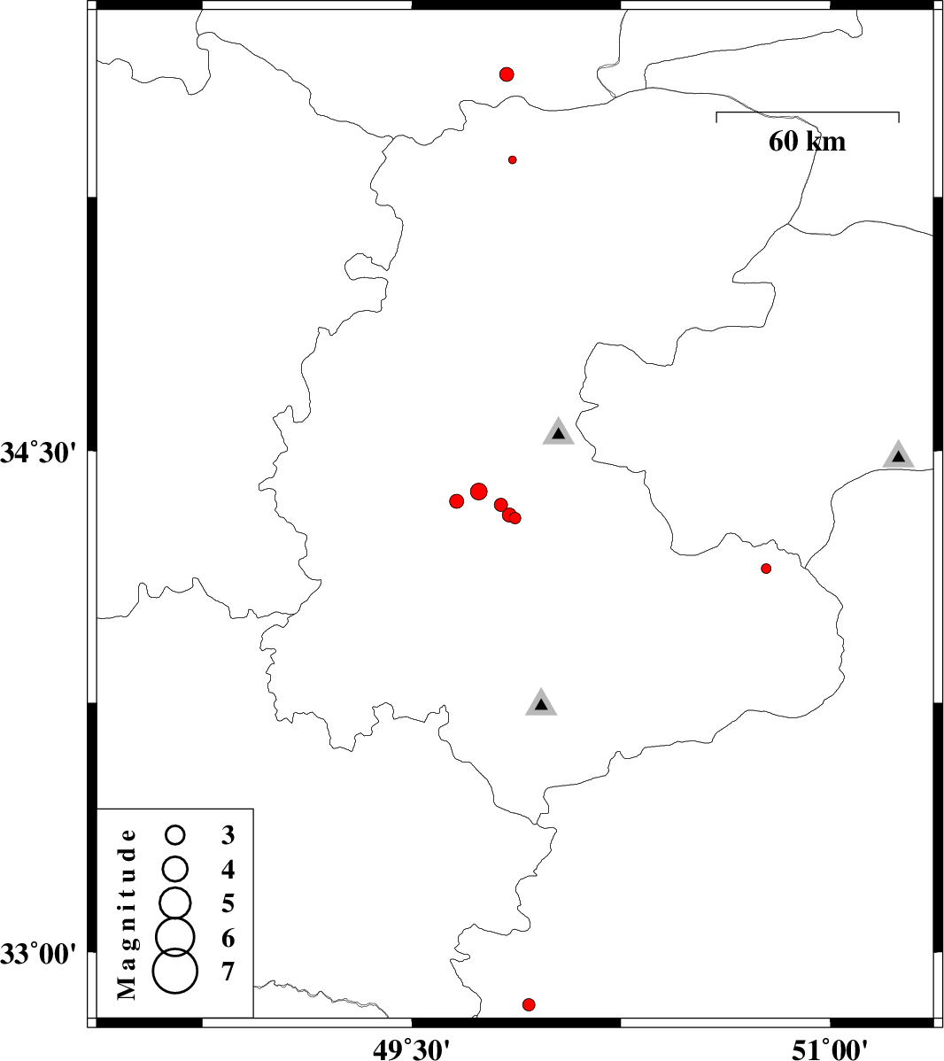 | 2012/02/10 | 10:57:02.2 | 14:27:02.2 | 34.35 | 49.66 | 15 | ML2.2 | Markazi Province, 29 km North of Arak | ||