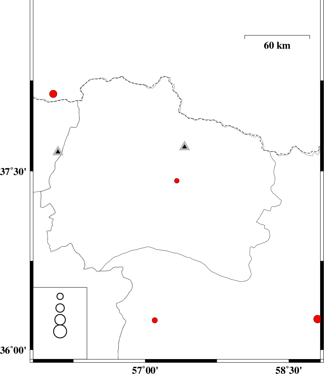 | 2012/02/18 | 07:20:26.8 | 10:50:26.8 | 37.42 | 57.33 | 14 | ML2.2 | Khorasan(north) Province, 6 km Bojnurd | ||