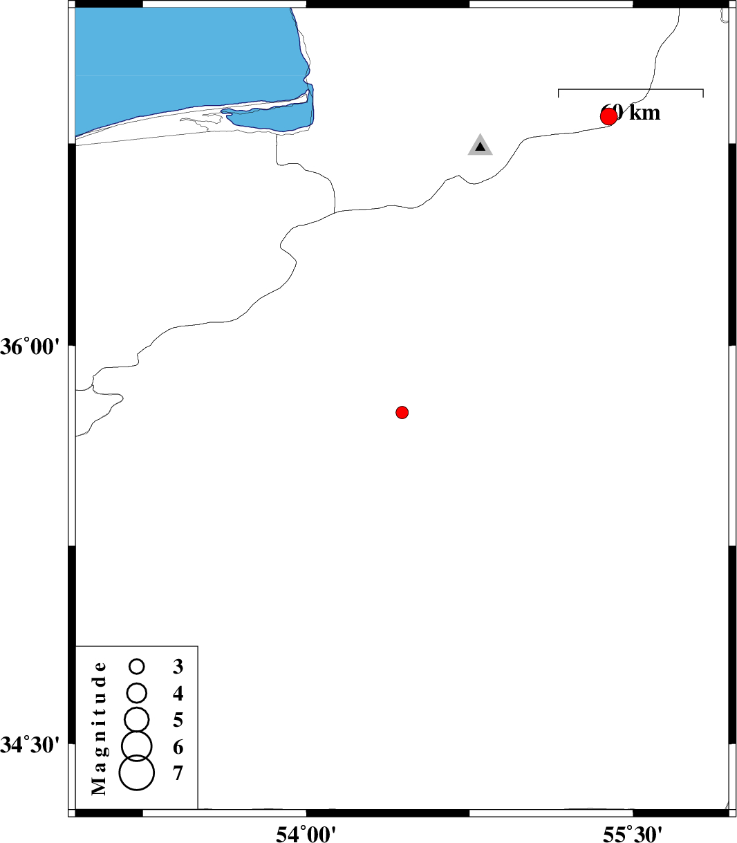 | 2012/02/13 | 15:09:44.6 | 18:39:44.6 | 36.85 | 55.39 | 14 | ML3.5 | Golestan Province, 42 km South of Minodasht |