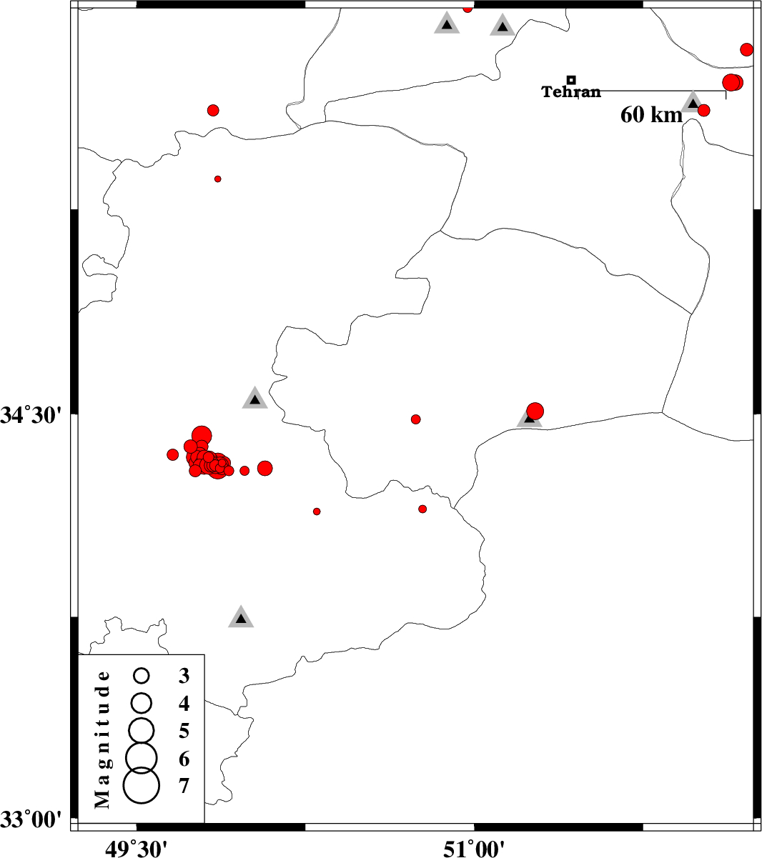 | 2012/01/31 | 04:06:05.8 | 07:36:05.8 | 34.32 | 49.82 | 24 | ML2.6 | Markazi Province, 29 km North-East of Arak | ||
