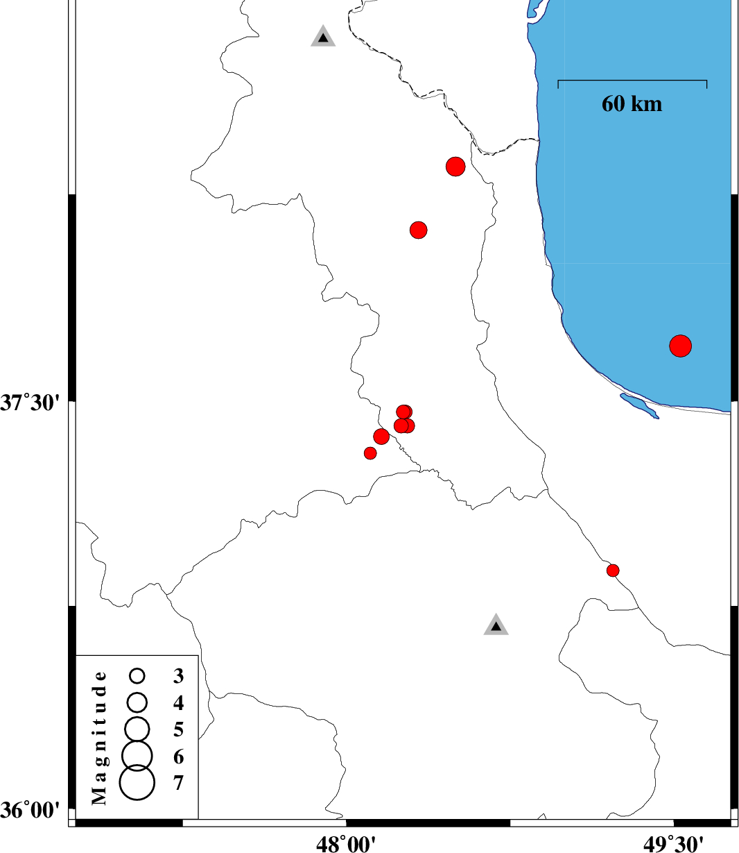 | 2012/02/04 | 20:04:14.0 | 23:34:14.0 | 37.7 | 49.53 | 40 | ML4.5 | Caspian Sea, 26 km North of Bandar-e anzali | ||
