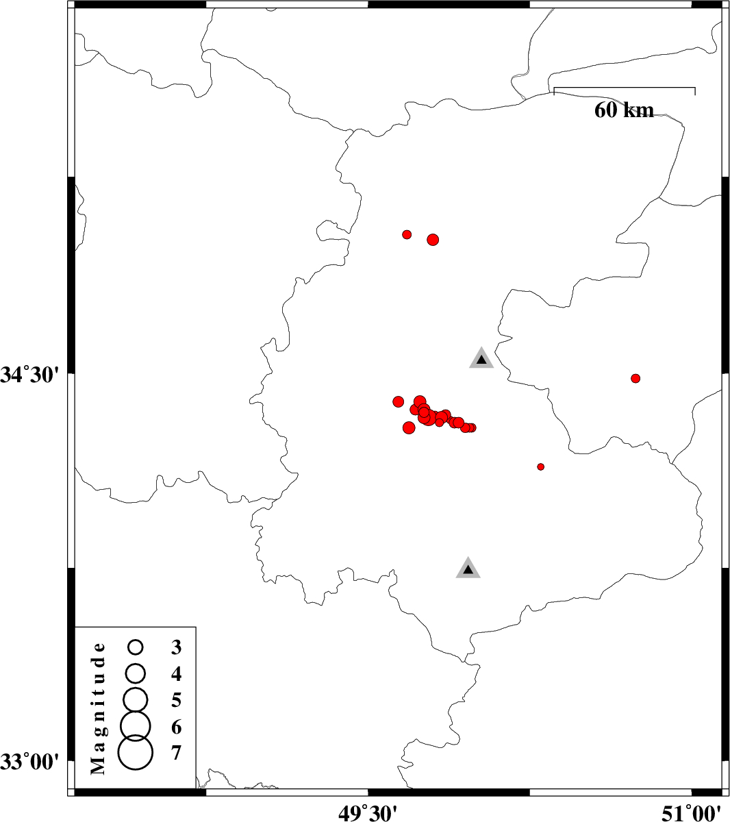 | 2012/02/20 | 17:40:07.4 | 21:10:07.4 | 34.29 | 49.98 | 6 | ML1.9 | Markazi Province, 27 km South of Ashtiyan | ||