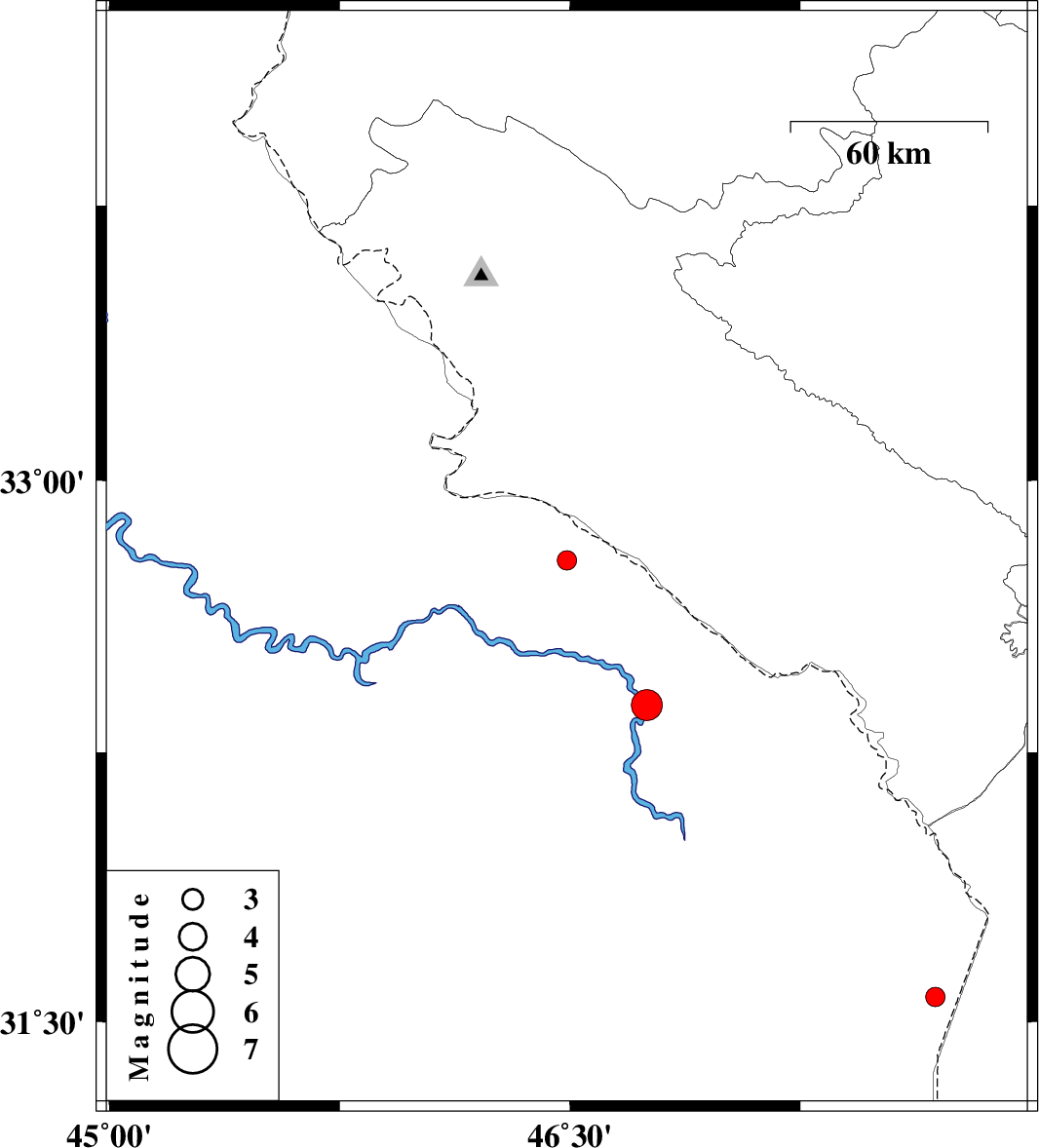 | 2012/02/28 | 23:18:49.5 | 02:48:49.5 | 32.38 | 46.75 | 15 | ML4.5 | Iraq, 59 km South-West of Dehloran | ||