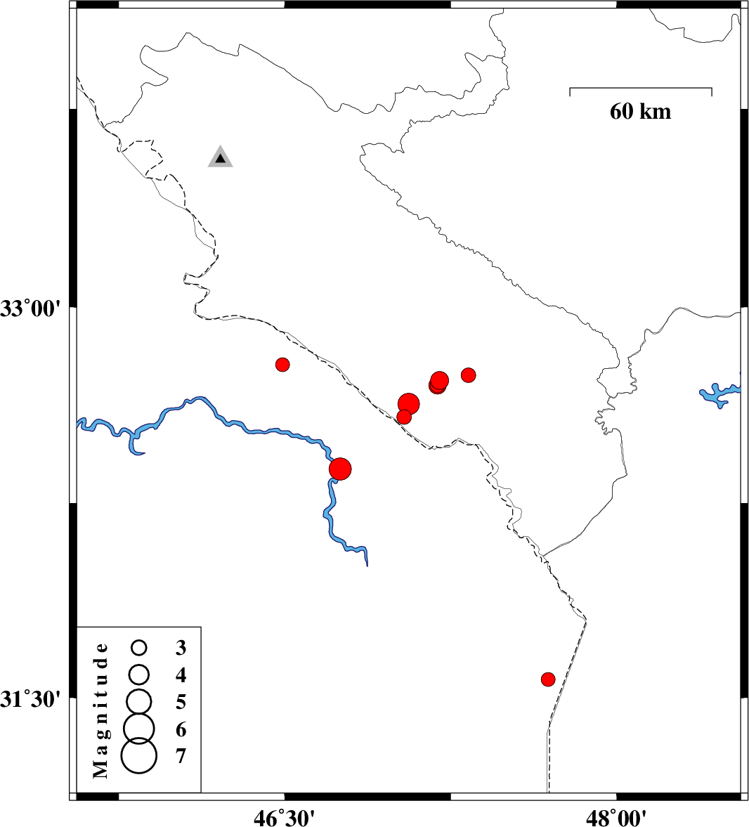 | 2012/02/29 | 06:33:44.9 | 10:03:44.9 | 32.74 | 47.33 | 14 | ML3 | Ilam Province, 8 km Dehloran | ||