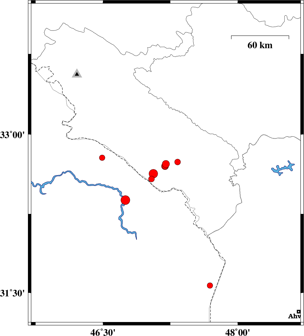 | 2012/02/29 | 06:33:44.9 | 10:03:44.9 | 32.74 | 47.33 | 14 | ML3 | Ilam Province, 8 km Dehloran | ||
