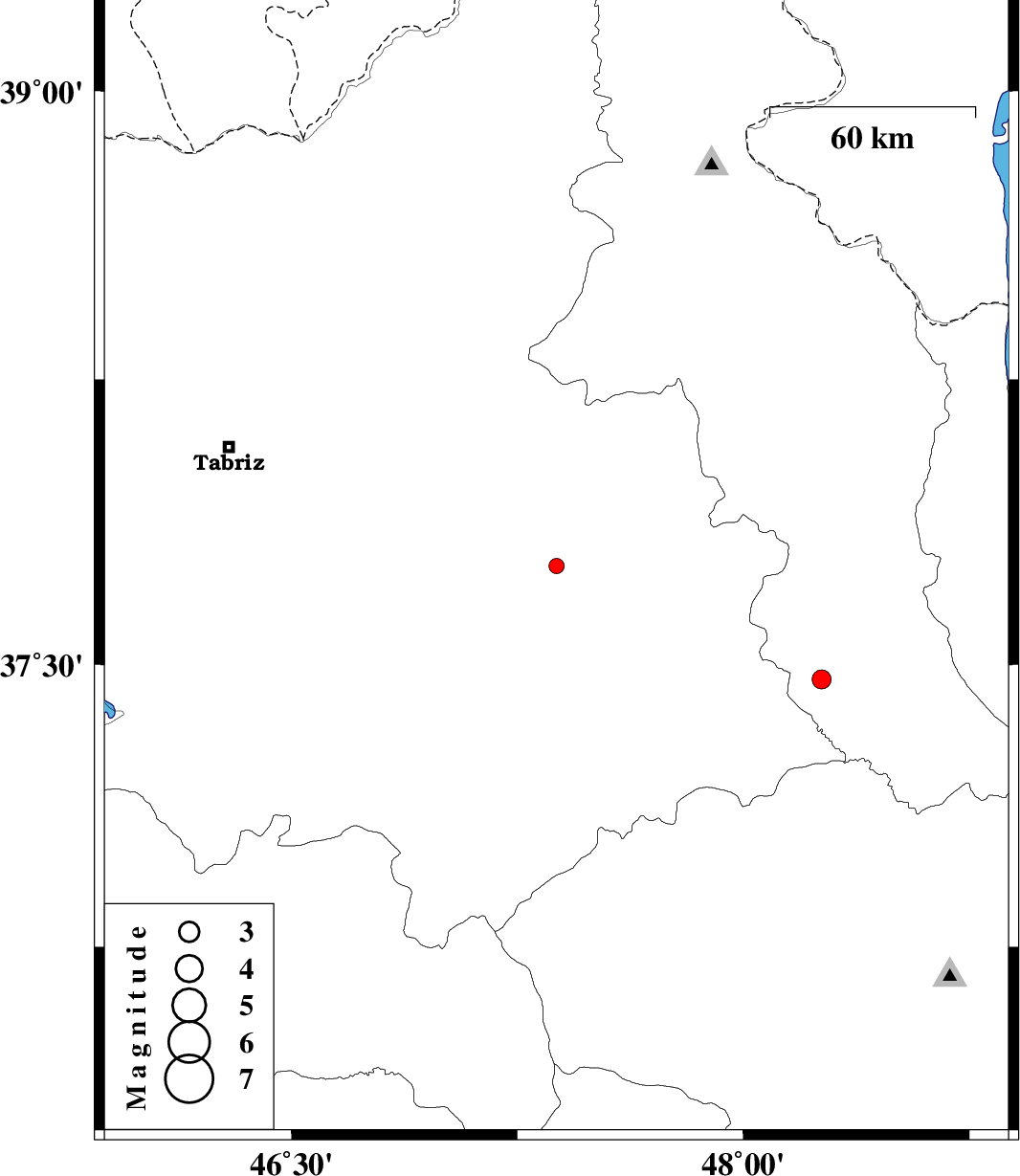 | 2012/02/25 | 00:46:03.9 | 04:16:03.9 | 37.46 | 48.26 | 15 | ML2.8 | Ardebil Province, 28 km South-West of Givi |