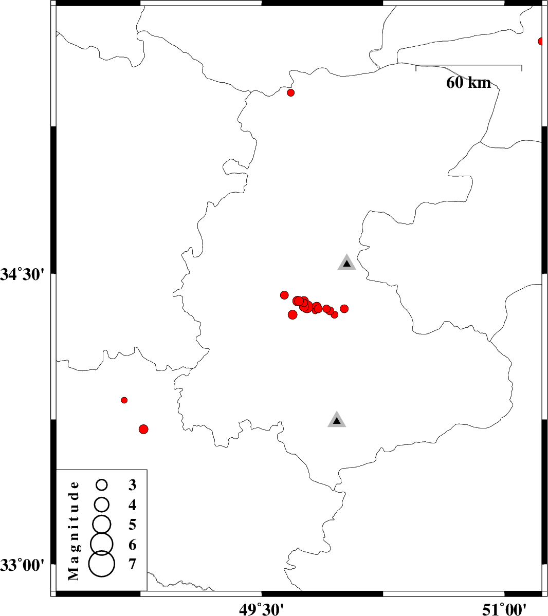 | 2012/03/02 | 00:33:10.1 | 04:03:10.1 | 33.85 | 48.65 | 35 | ML1.7 | Lorestan Province, 11 km West of Borujerd | ||