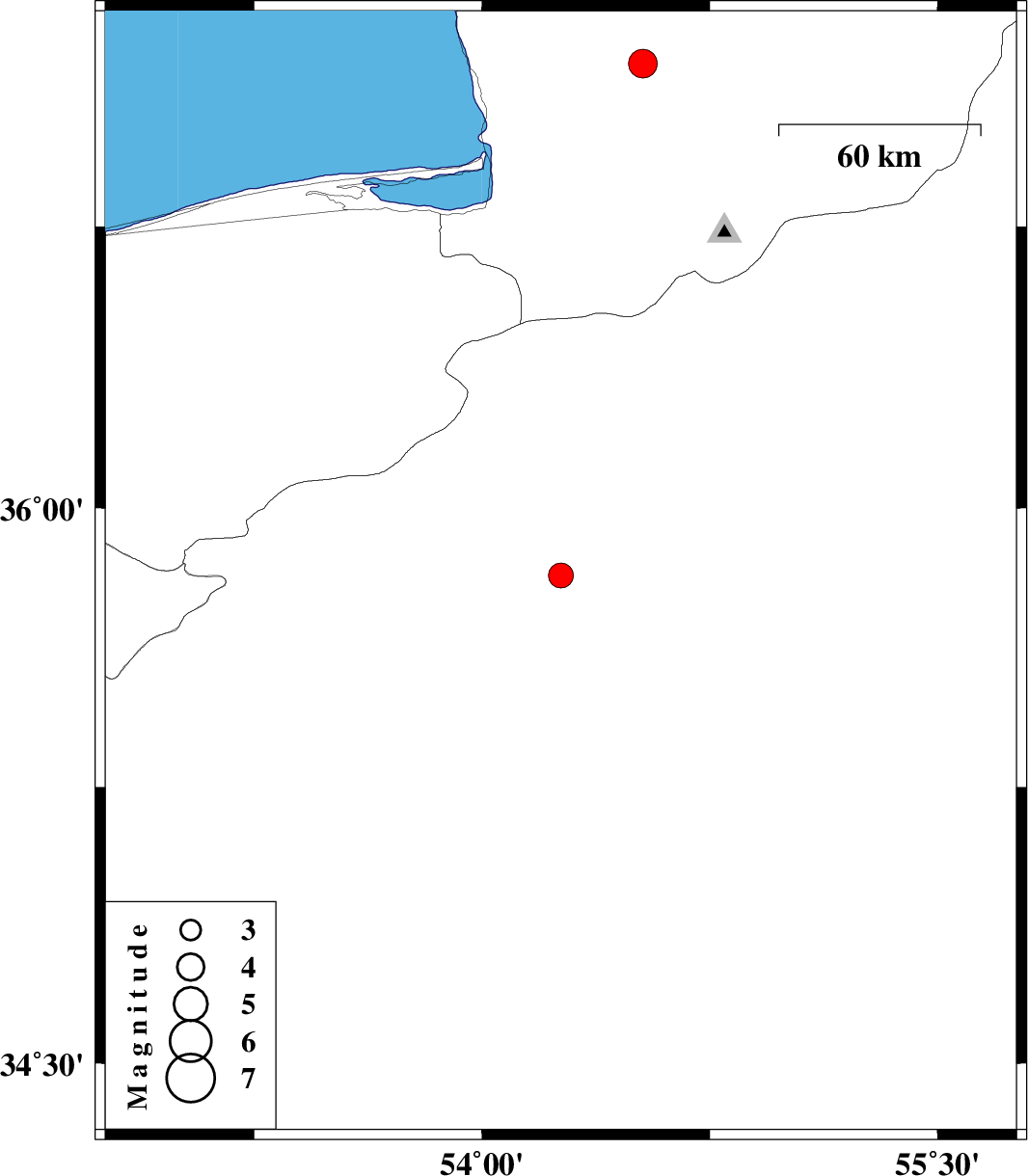 | 2012/03/06 | 06:34:25.3 | 10:04:25.3 | 35.82 | 54.26 | 16 | ML3.6 | Semnan Province, 39 km South of Damghan | ||