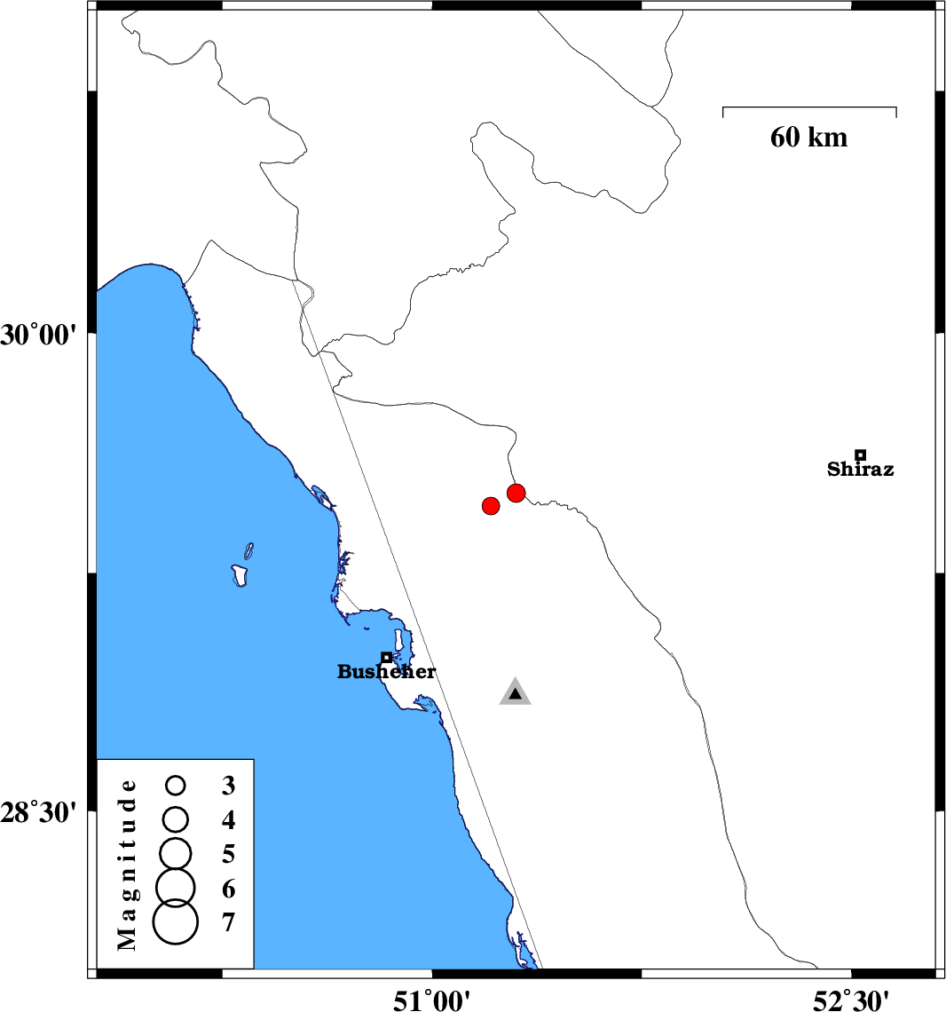 | 2012/03/06 | 17:59:08.8 | 21:29:08.8 | 29.5 | 51.3 | 31 | ML2.9 | Bushehr Province, 28 km North of Borazjan |