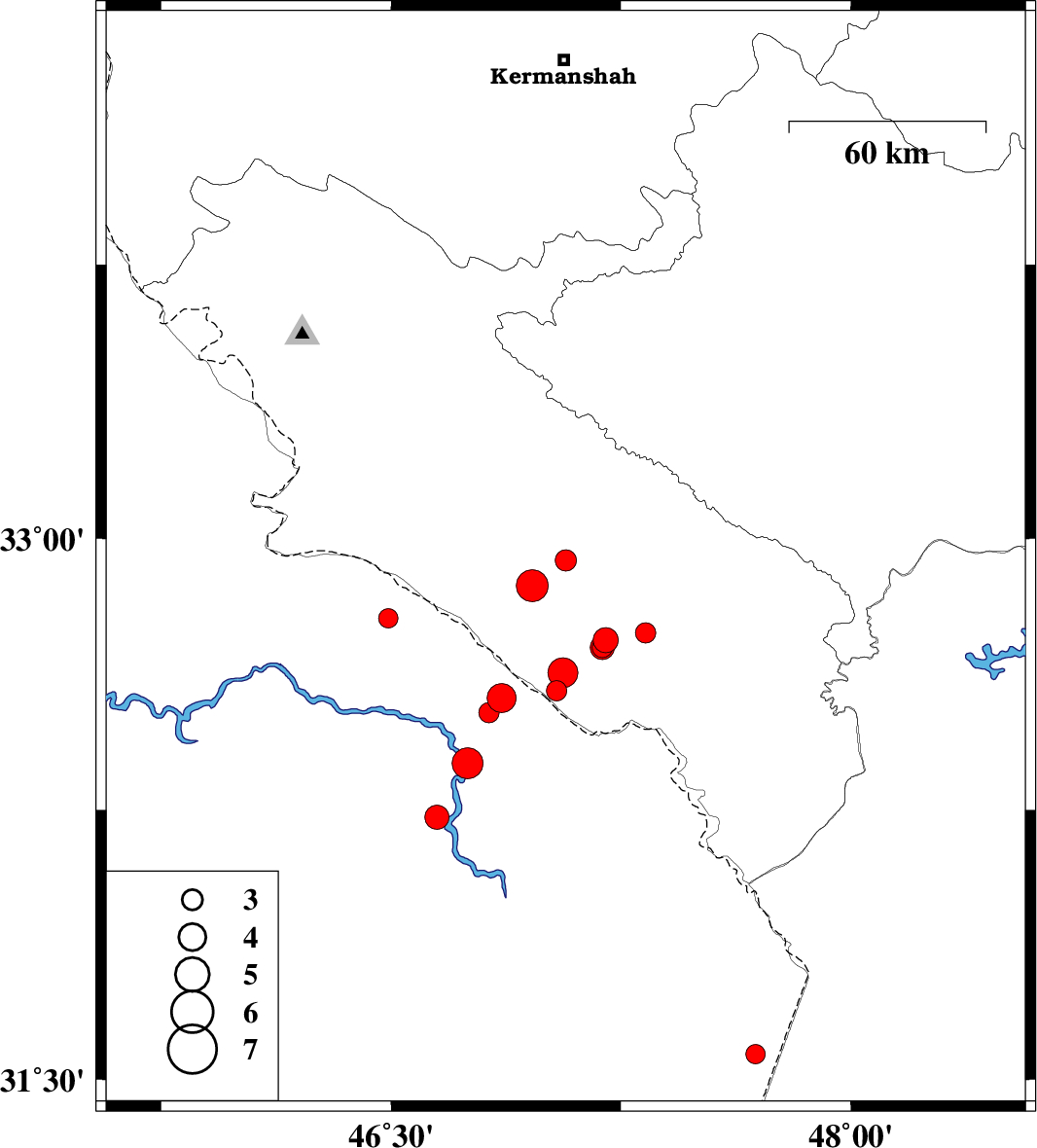 | 2012/03/03 | 15:48:48.3 | 19:18:48.3 | 32.52 | 46.82 | 18 | ML3 | Iraq, 46 km South-West of Dehloran | ||