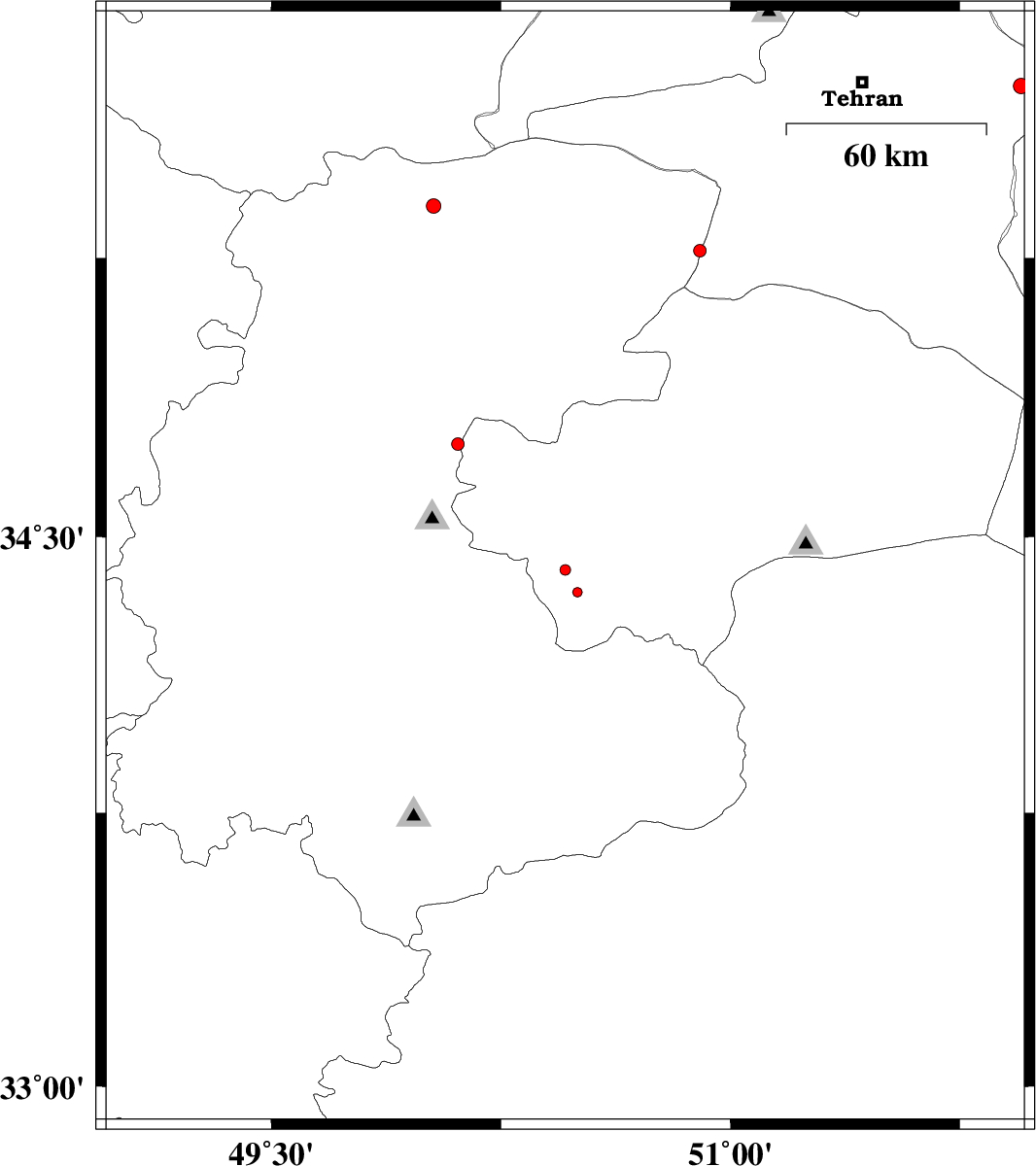 | 2012/03/10 | 19:43:50.7 | 23:13:50.7 | 35.71 | 51.95 | 9 | ML2.3 | Tehran Province, 11 km West of Damavand | ||