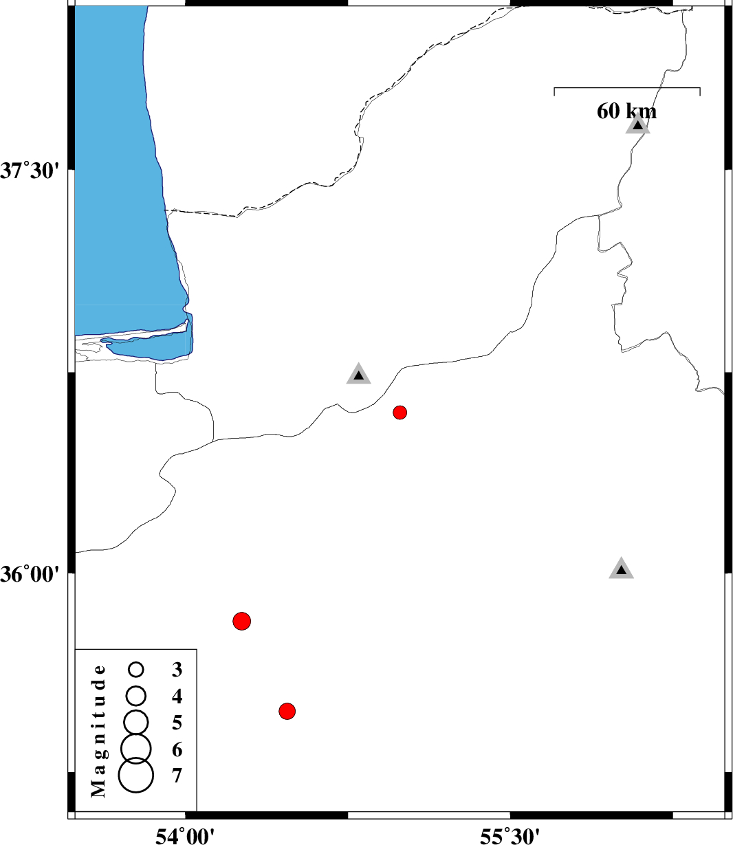 | 2012/03/06 | 06:34:25.3 | 10:04:25.3 | 35.82 | 54.26 | 16 | ML3.6 | Semnan Province, 39 km South of Damghan |