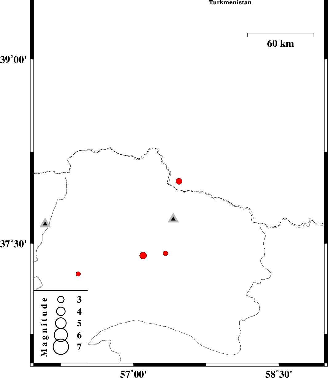 | 2012/02/18 | 07:20:26.8 | 10:50:26.8 | 37.42 | 57.33 | 14 | ML2.2 | Khorasan(north) Province, 6 km Bojnurd |