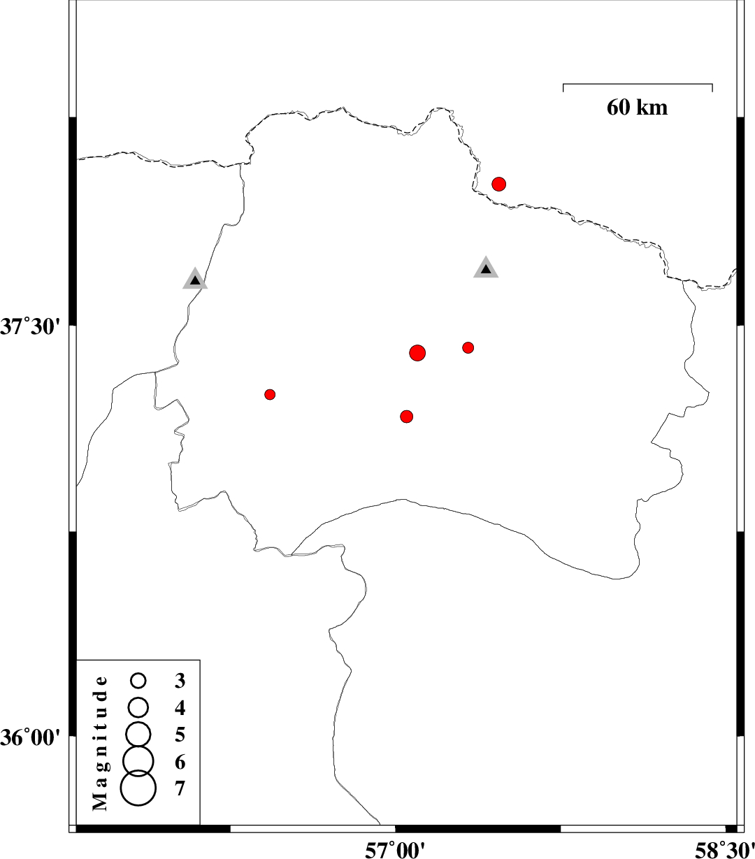 | 2012/02/18 | 07:20:26.8 | 10:50:26.8 | 37.42 | 57.33 | 14 | ML2.2 | Khorasan(north) Province, 6 km Bojnurd |