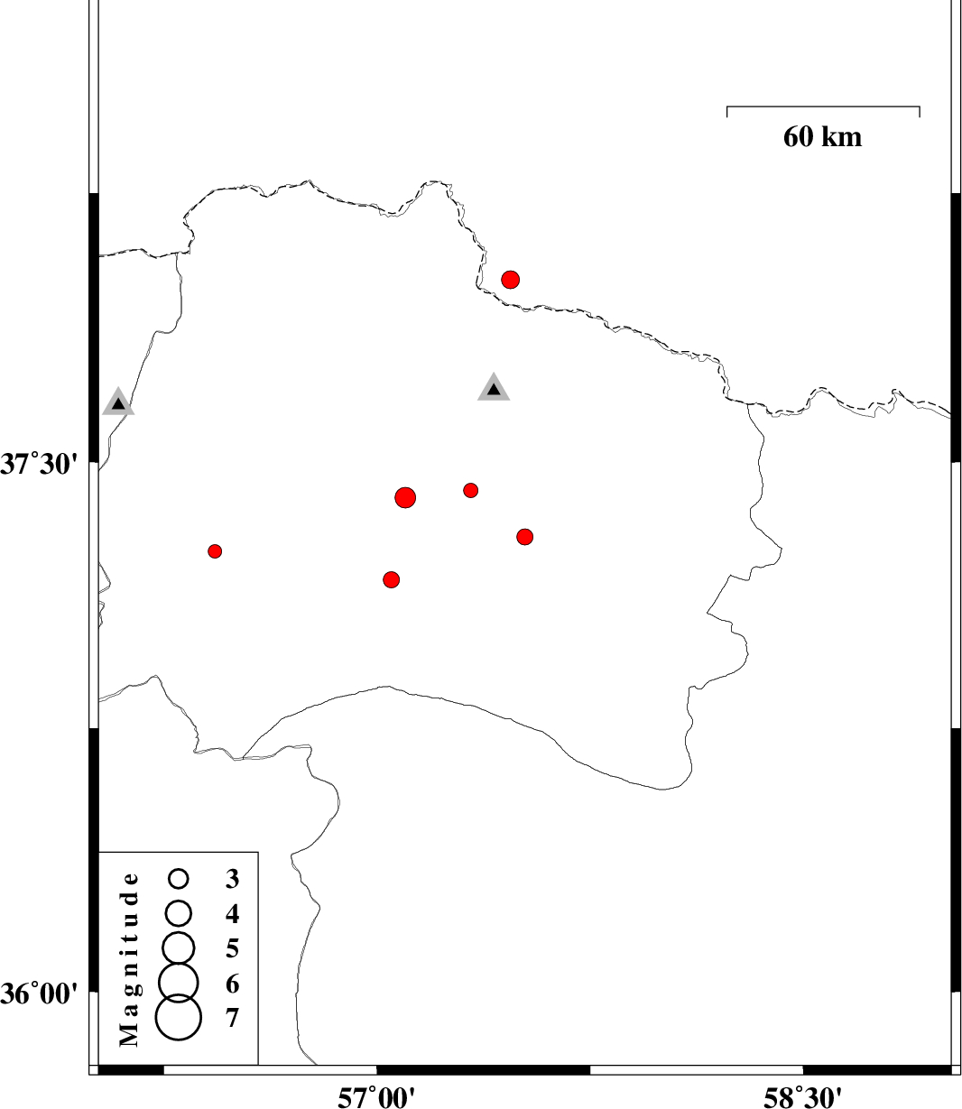 | 2012/02/18 | 07:20:26.8 | 10:50:26.8 | 37.42 | 57.33 | 14 | ML2.2 | Khorasan(north) Province, 6 km Bojnurd |
