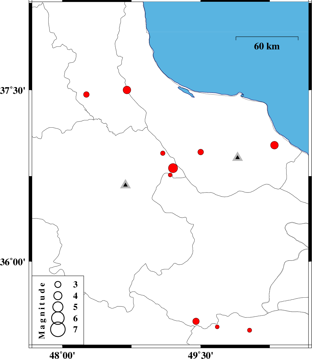 | 2012/03/11 | 03:28:51.3 | 06:58:51.3 | 37.5 | 48.7 | 14 | ML3.8 | Gilan Province, 20 km South-East of Khalkhal | ||