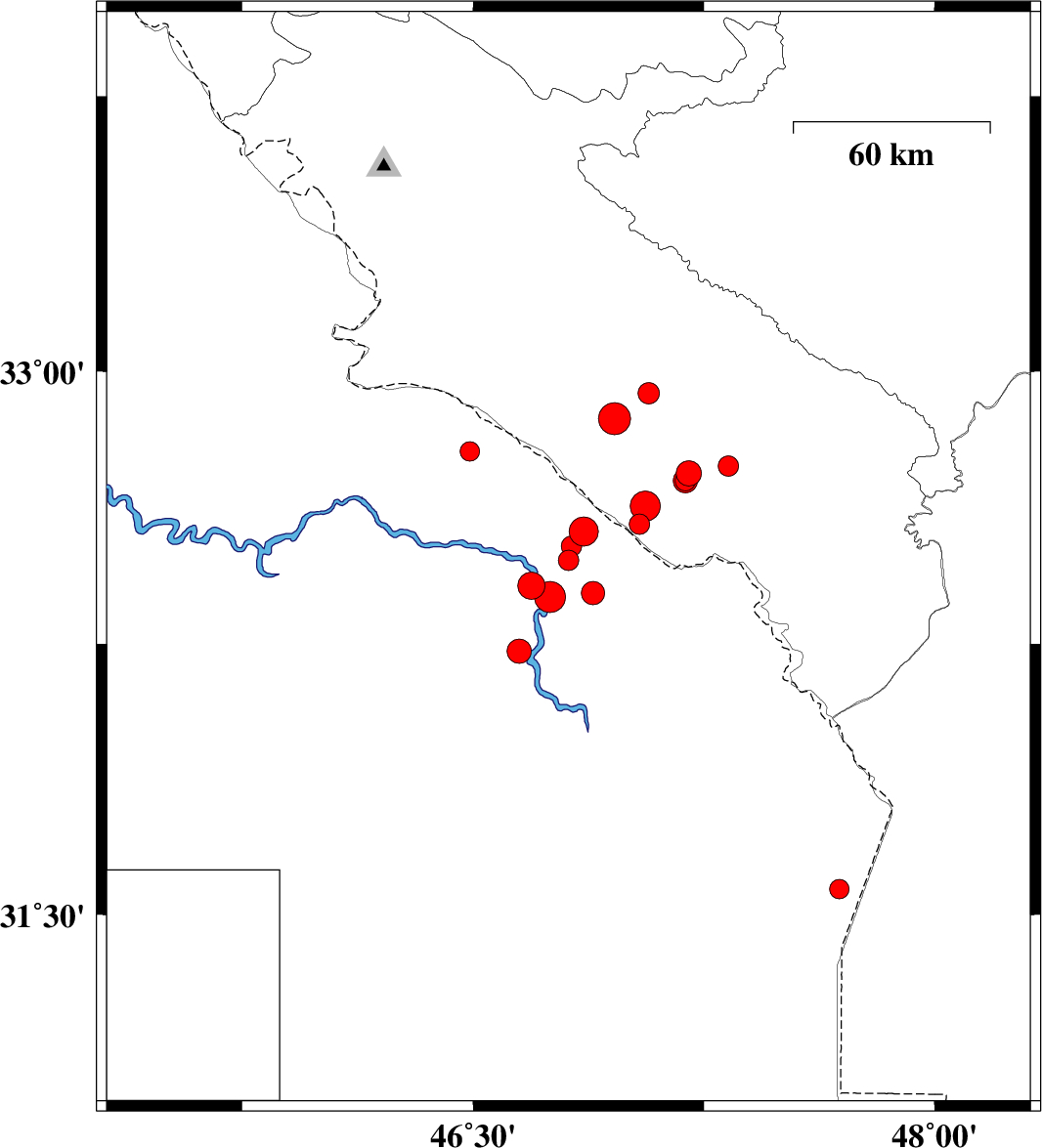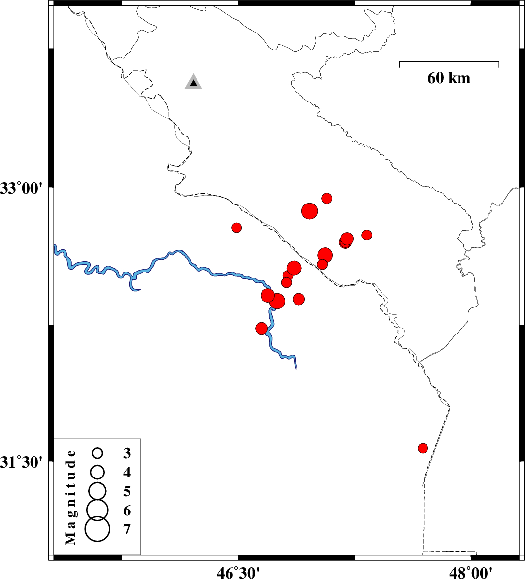 | 2012/03/03 | 15:48:48.3 | 19:18:48.3 | 32.52 | 46.82 | 18 | ML3 | Iraq, 46 km South-West of Dehloran | ||