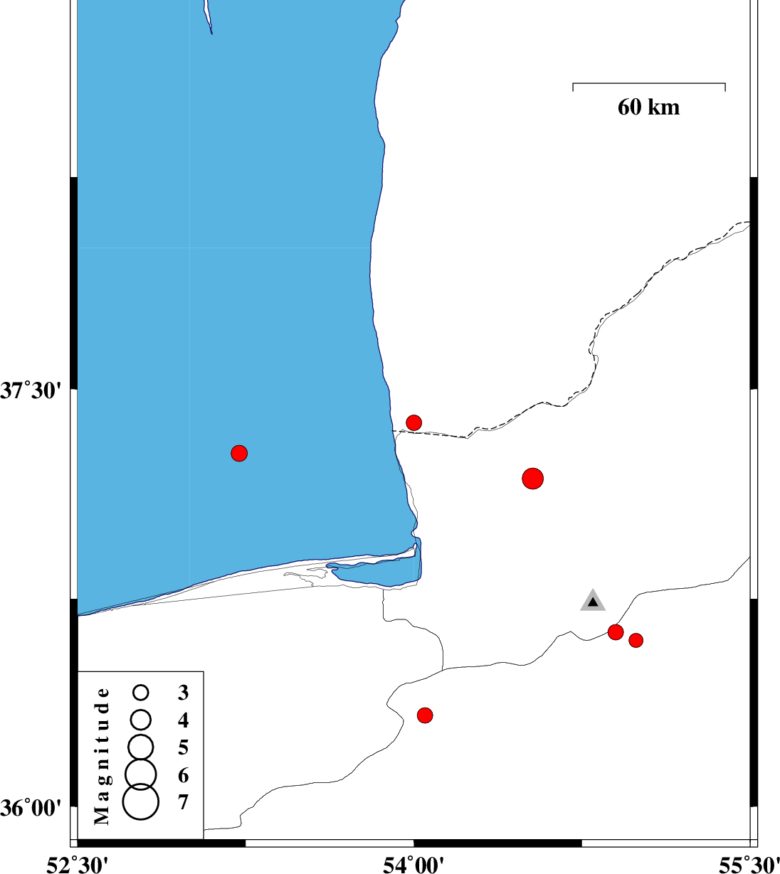 | 2012/03/19 | 03:03:24.2 | 06:33:24.2 | 37.38 | 54 | 14 | ML3.1 | 54 km North of Bandar-e torkaman | ||