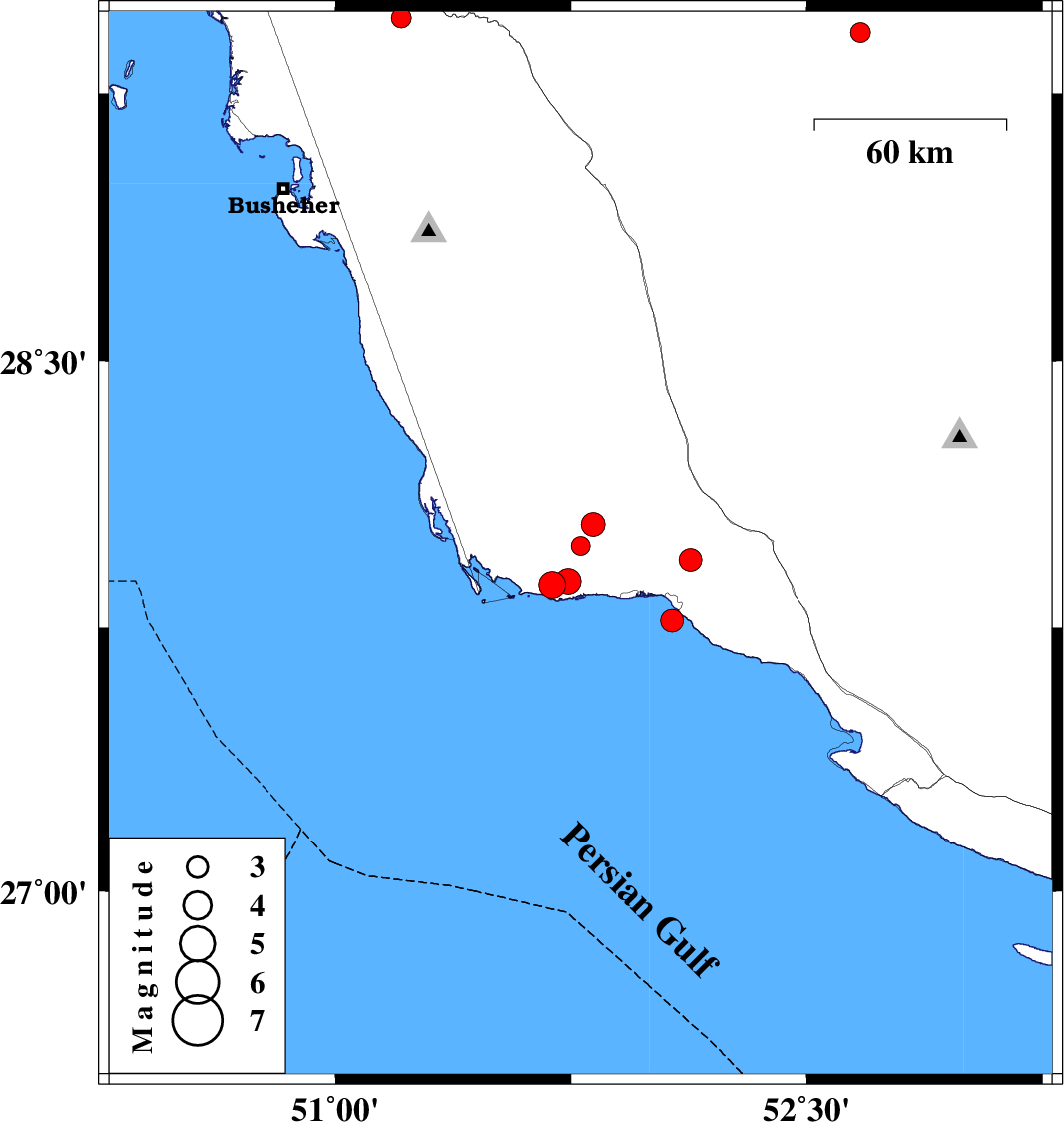 | 2012/03/06 | 20:09:54.8 | 23:39:54.8 | 29.46 | 51.21 | 45 | ML2.8 | Bushehr Province, 22 km North of Borazjan |