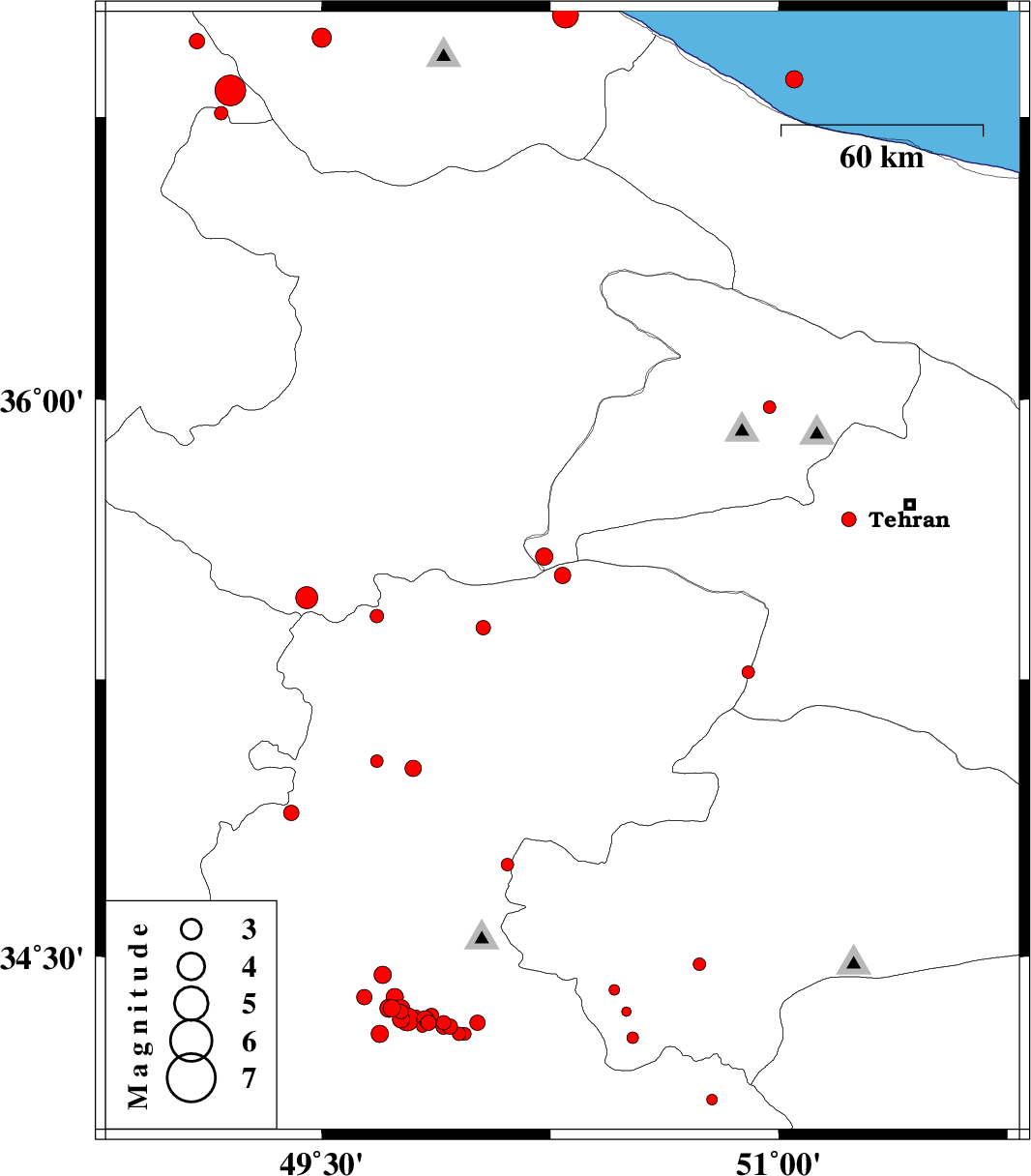 | 2012/03/17 | 01:47:18.1 | 05:17:18.1 | 36.85 | 51.05 | 14 | ML2.6 | Caspian Sea, 14 km East of Tonekabon | ||
