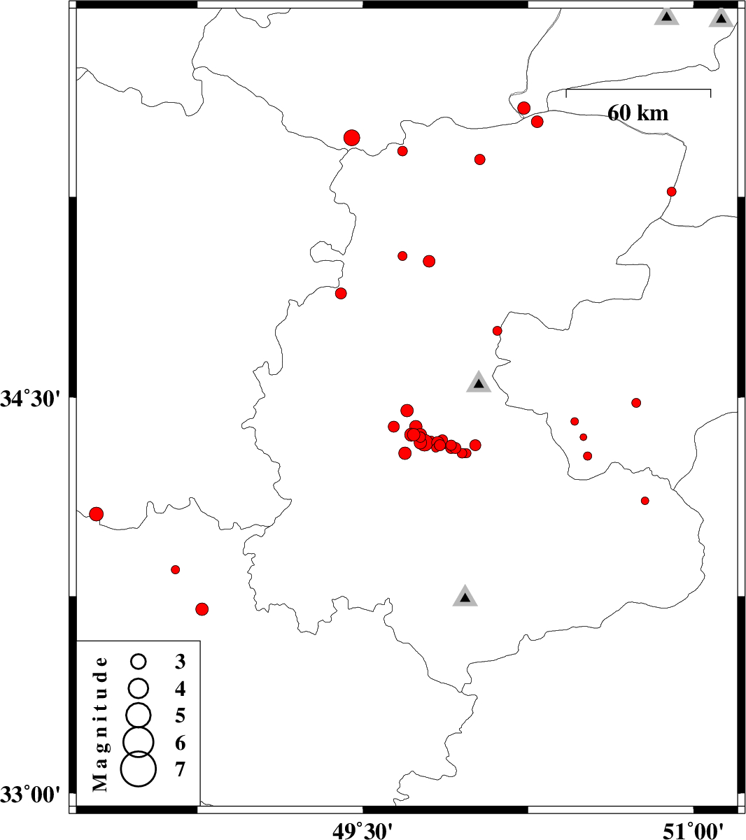 | 2012/03/02 | 00:33:10.1 | 04:03:10.1 | 33.85 | 48.65 | 35 | ML1.7 | Lorestan Province, 11 km West of Borujerd | ||