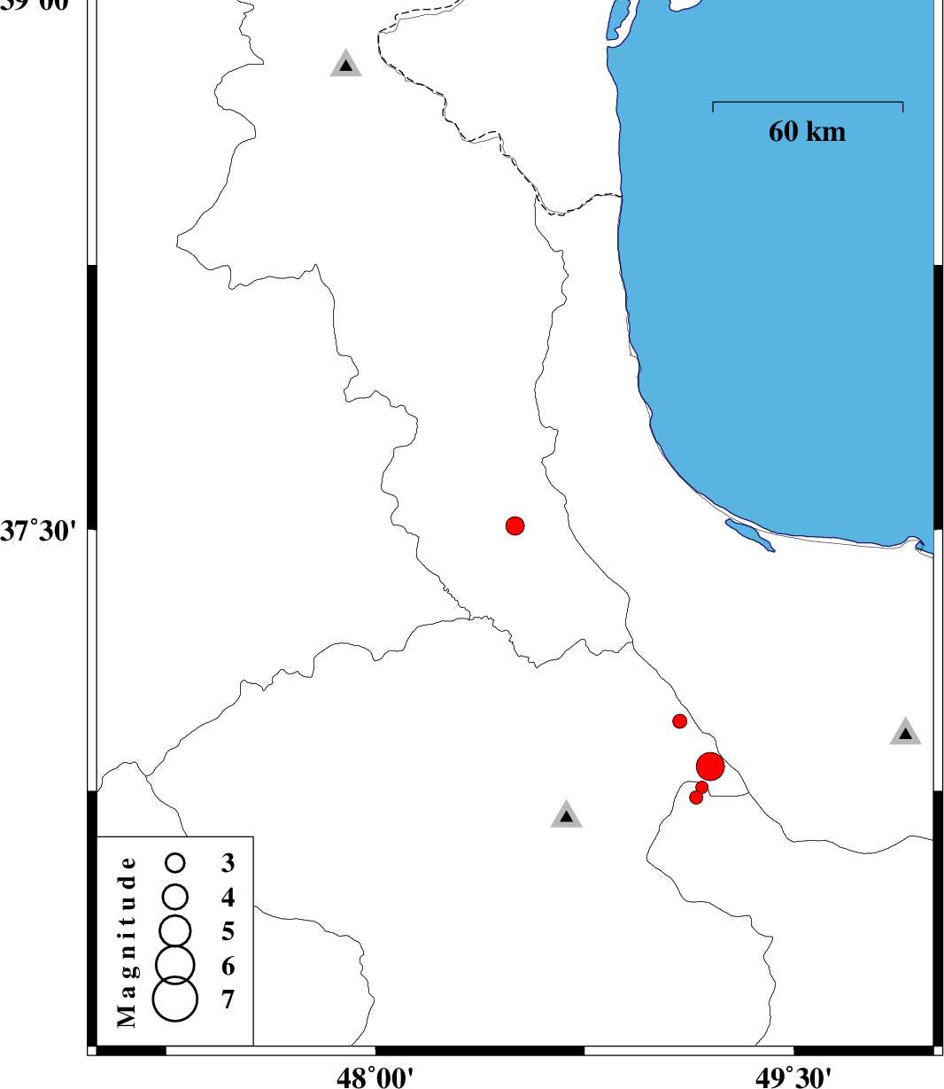 | 2012/03/23 | 05:13:08.1 | 09:43:08.1 | 37.51 | 48.5 | 14 | ML3 | Ardebil Province, 13 km South of Khalkhal | ||