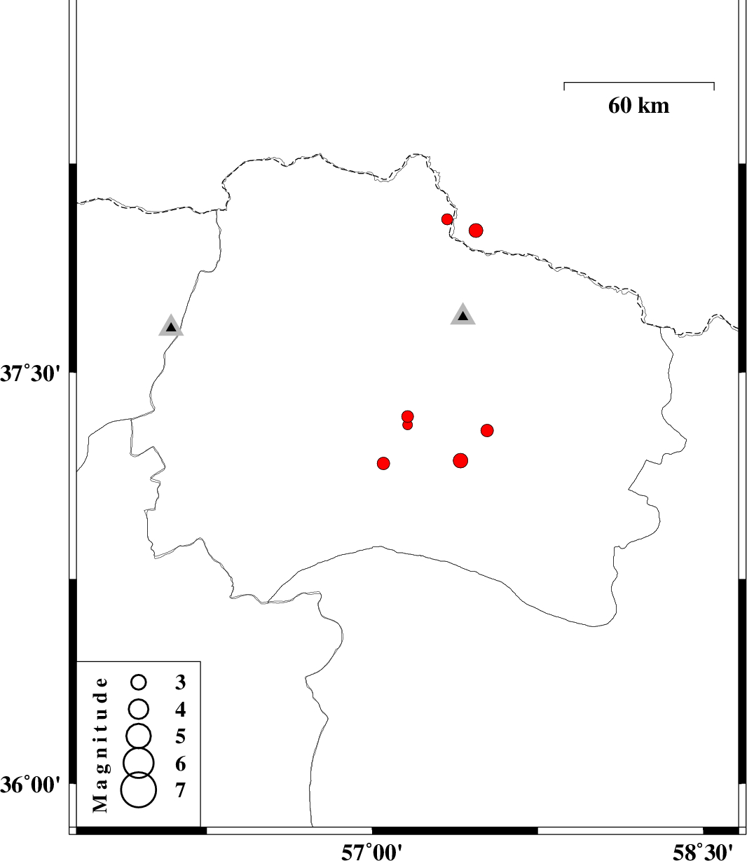 | 2012/03/18 | 06:59:10.2 | 10:29:10.2 | 37.29 | 57.52 | 17 | ML2.5 | Khorasan(north) Province, 26 km North of Esfarayen | ||