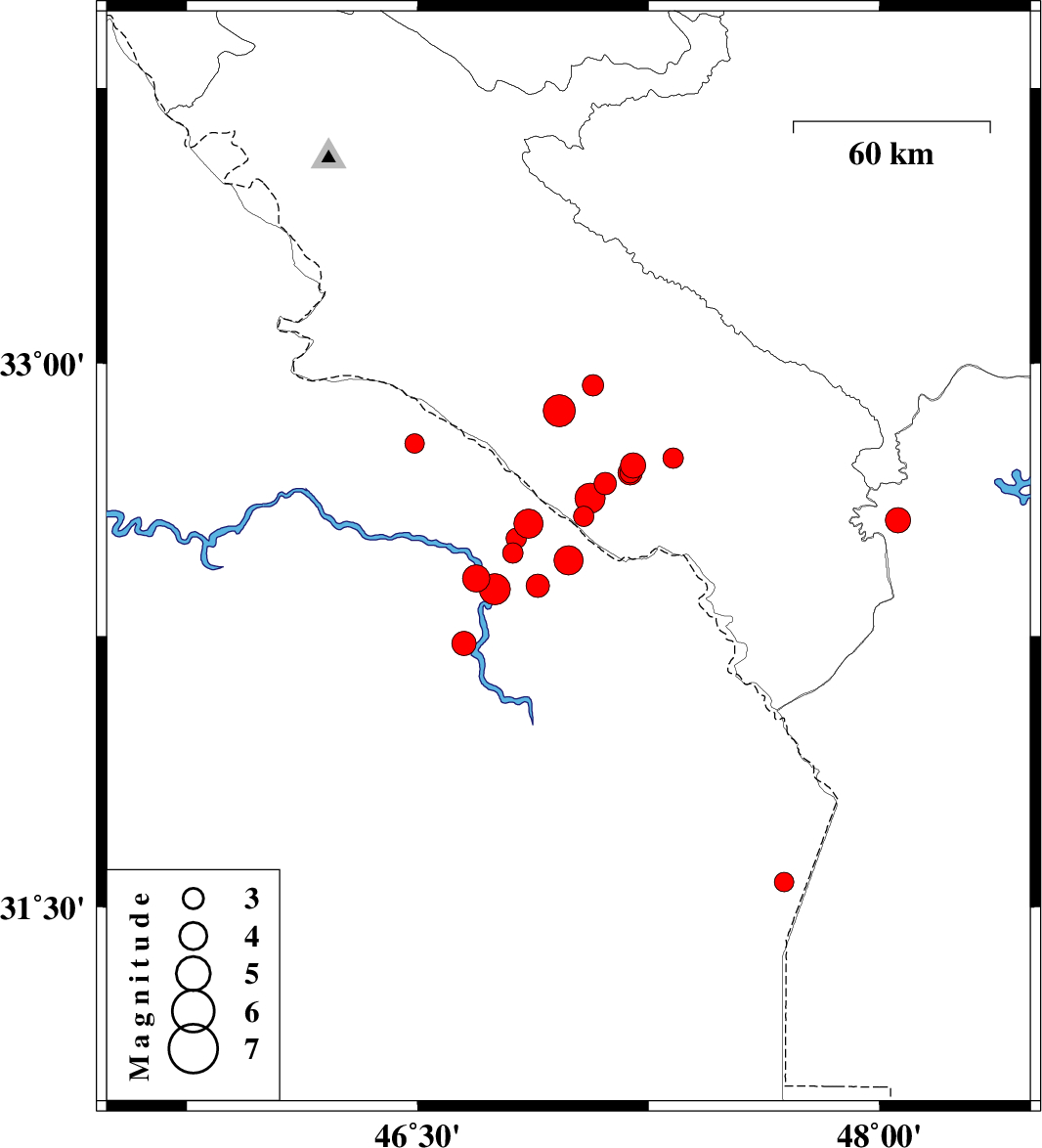 | 2012/03/03 | 15:48:48.3 | 19:18:48.3 | 32.52 | 46.82 | 18 | ML3 | Iraq, 46 km South-West of Dehloran | ||