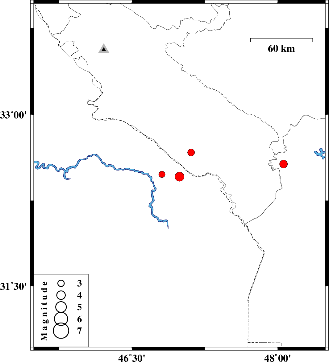 | 2012/03/24 | 05:25:36.7 | 09:55:36.7 | 32.46 | 46.99 | 44 | ML4.2 | Iraq, 36 km South-West of Dehloran | ||