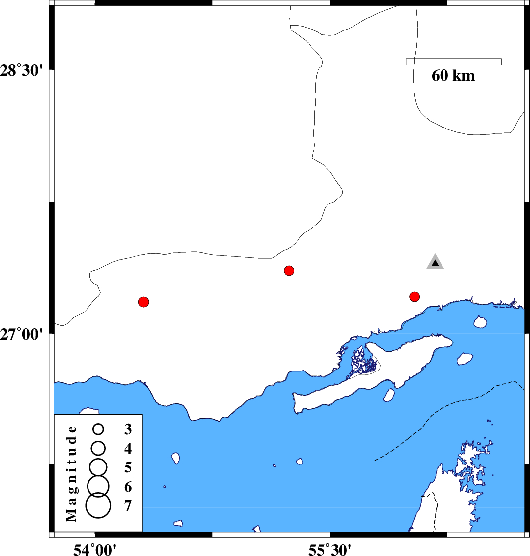 | 2012/03/25 | 05:00:07.7 | 09:30:07.7 | 27.21 | 56.04 | 14 | ML2.8 | Hormozgan Province, 25 km West of Bandar-e abbas | ||