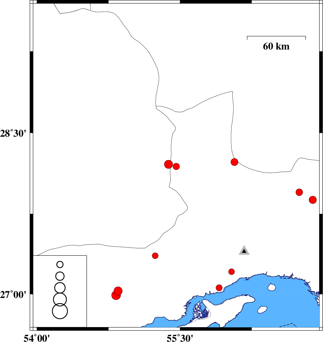 | 2012/03/25 | 05:00:07.7 | 09:30:07.7 | 27.21 | 56.04 | 14 | ML2.8 | Hormozgan Province, 25 km West of Bandar-e abbas | ||