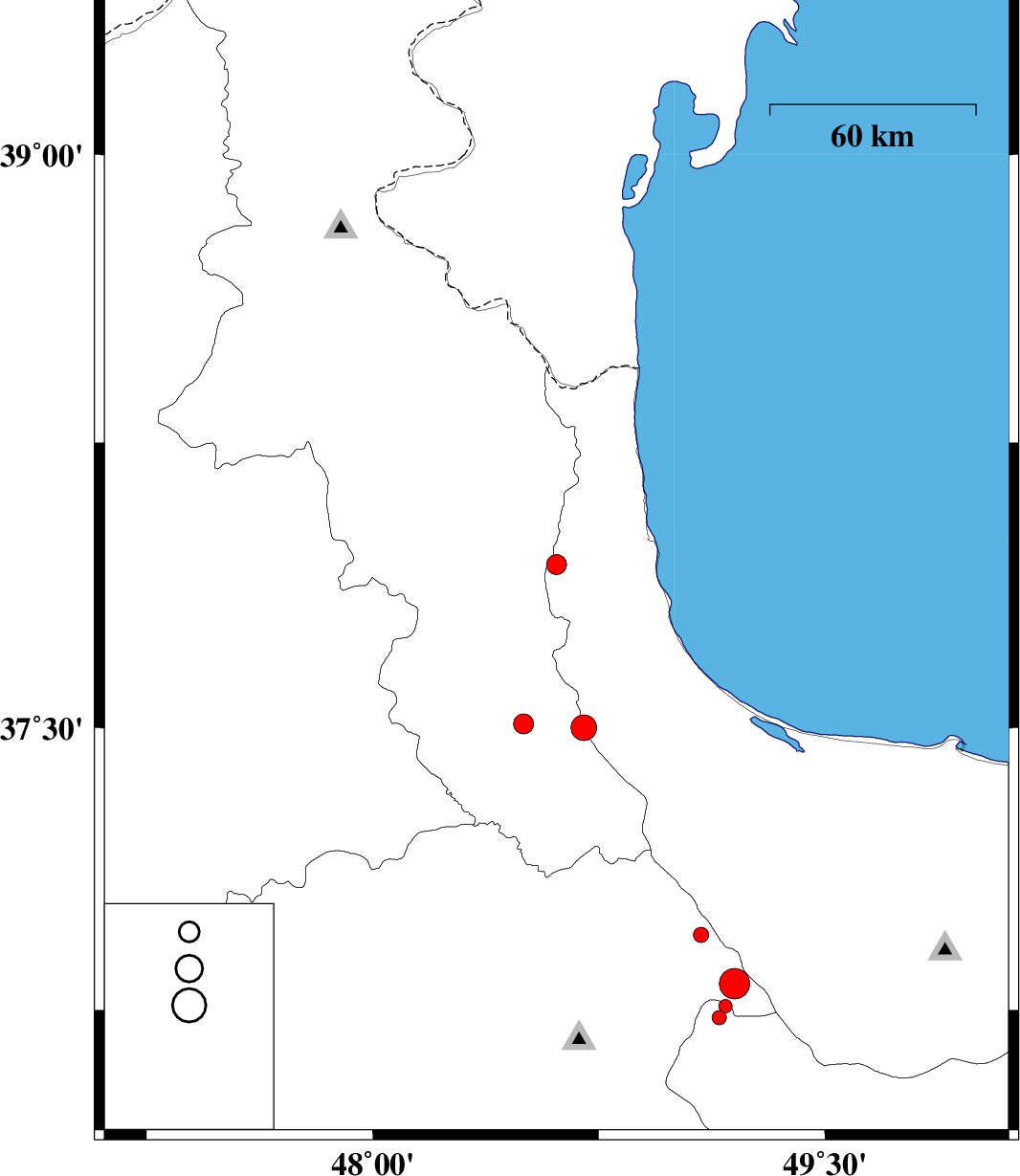 | 2012/03/11 | 03:28:51.3 | 06:58:51.3 | 37.5 | 48.7 | 14 | ML3.8 | Gilan Province, 20 km South-East of Khalkhal |