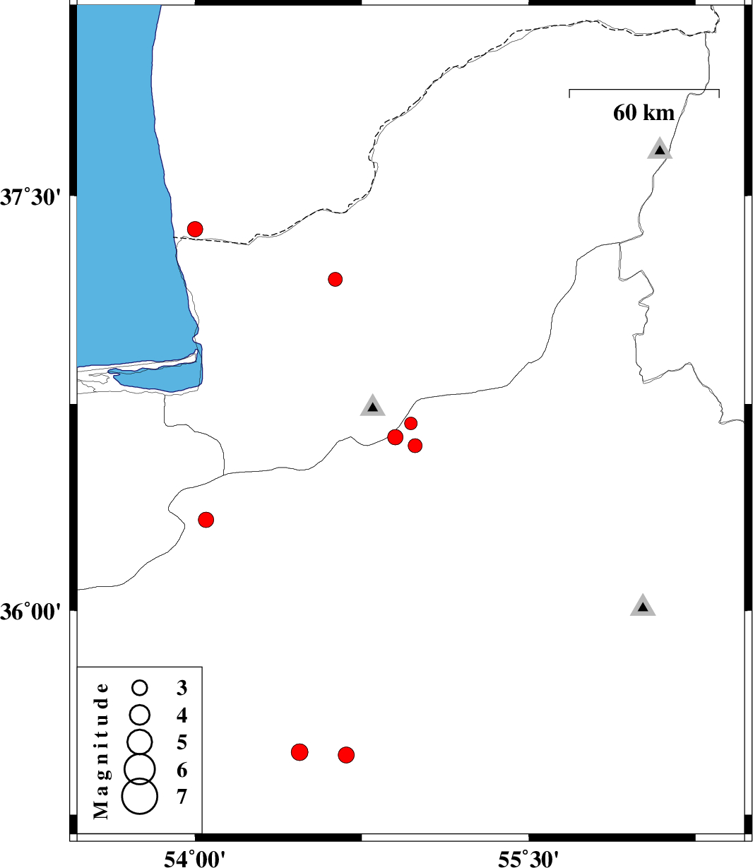 | 2012/03/19 | 03:03:24.2 | 06:33:24.2 | 37.38 | 54 | 14 | ML3.1 | 54 km North of Bandar-e torkaman | ||