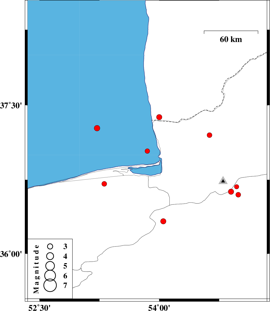 | 2012/03/19 | 03:03:24.2 | 06:33:24.2 | 37.38 | 54 | 14 | ML3.1 | 54 km North of Bandar-e torkaman | ||