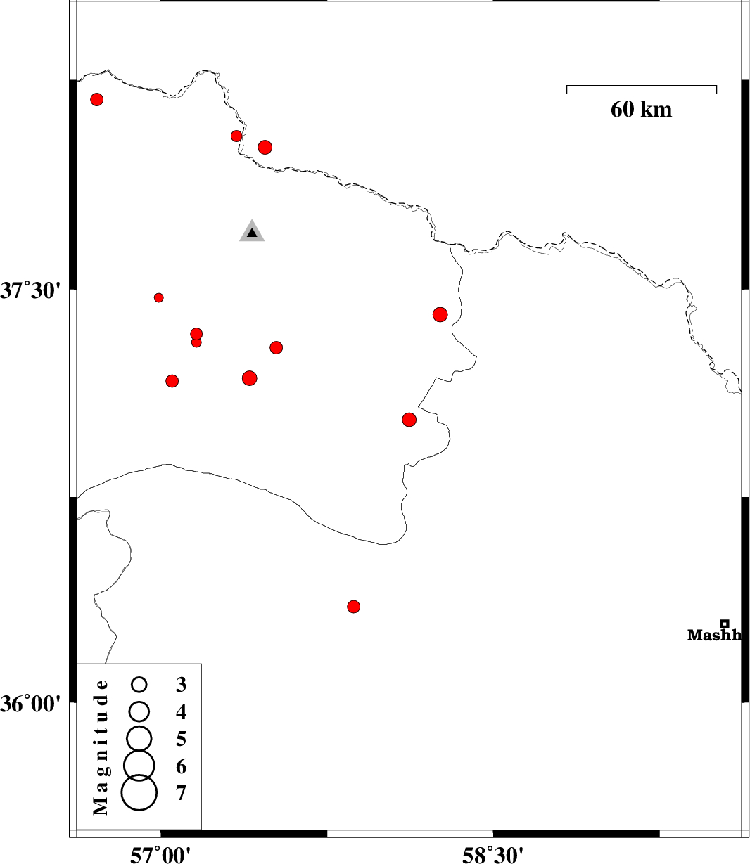 | 2012/04/11 | 10:39:28.9 | 15:09:28.9 | 37.03 | 58.12 | 14 | ML2.8 | Khorasan(center) Province, 36 km West of Quchan | ||
