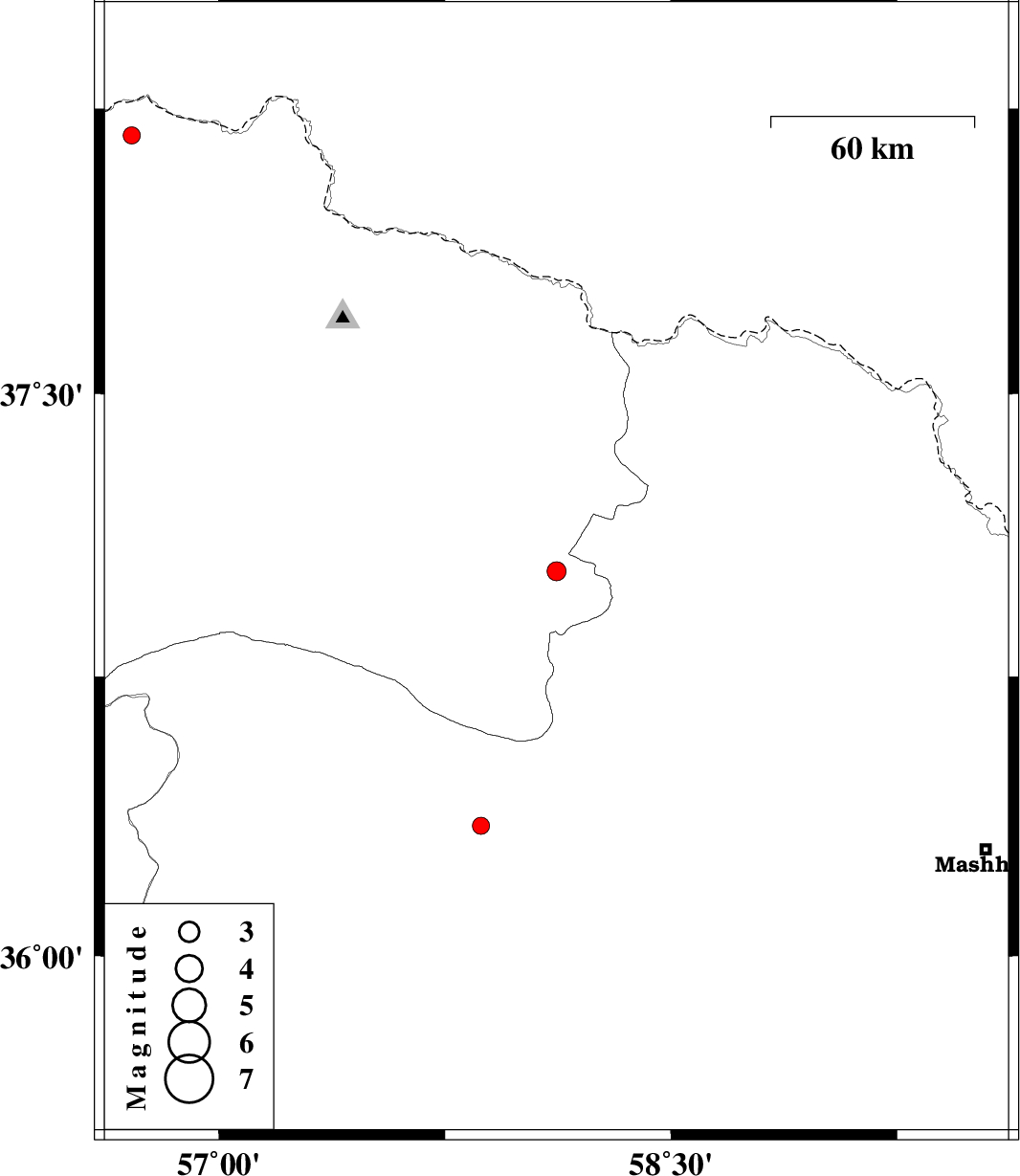 | 2012/04/11 | 10:39:28.9 | 15:09:28.9 | 37.03 | 58.12 | 14 | ML2.8 | Khorasan(center) Province, 36 km West of Quchan | ||