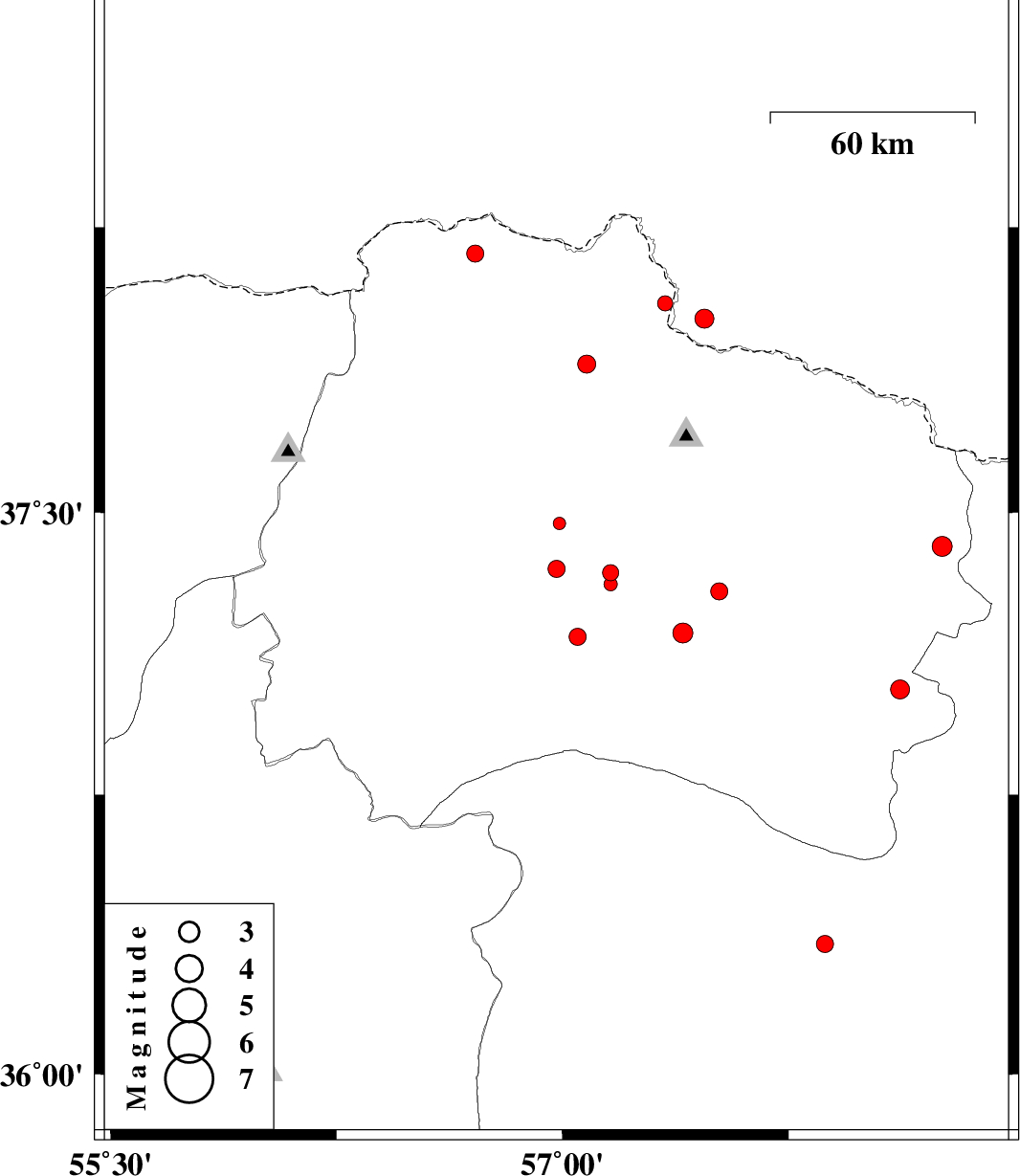 | 2012/03/16 | 23:01:24.8 | 02:31:24.8 | 38.01 | 57.47 | 14 | ML2.8 | 61 km North-East of Bojnurd |