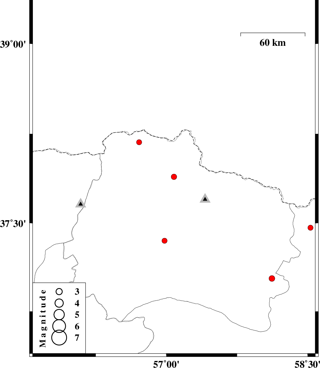 | 2012/04/13 | 00:08:10.1 | 04:38:10.1 | 37.46 | 58.53 | 14 | ML2.6 | Khorasan(center) Province, 39 km North of Quchan | ||