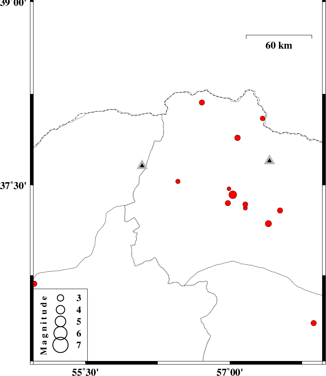 | 2012/03/18 | 06:59:10.2 | 10:29:10.2 | 37.29 | 57.52 | 17 | ML2.5 | Khorasan(north) Province, 26 km North of Esfarayen |