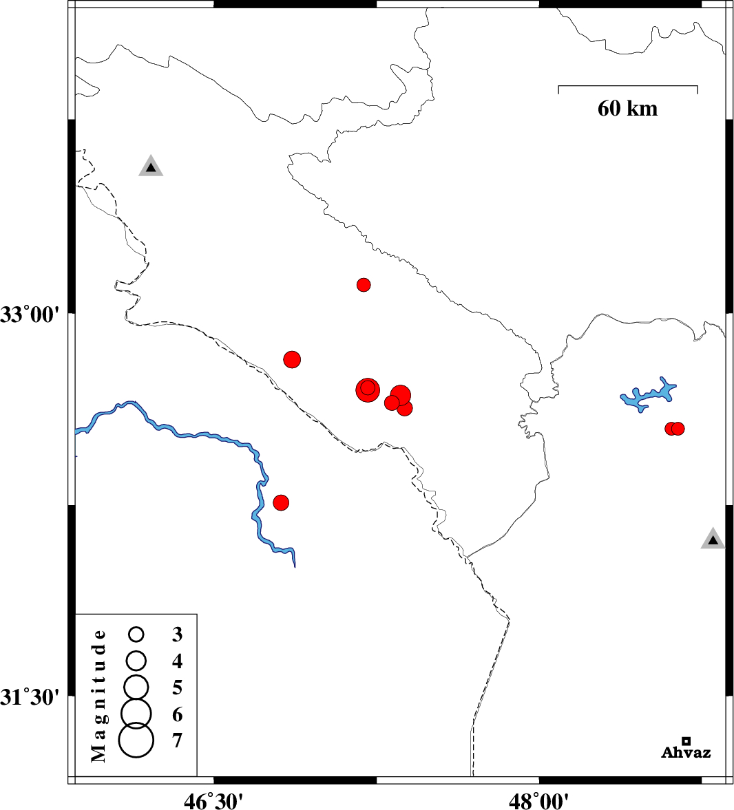 | 2012/04/18 | 20:04:12.3 | 00:34:12.3 | 32.68 | 47.36 | 14 | ML4.2 | Ilam Province, 9 km Dehloran | ||