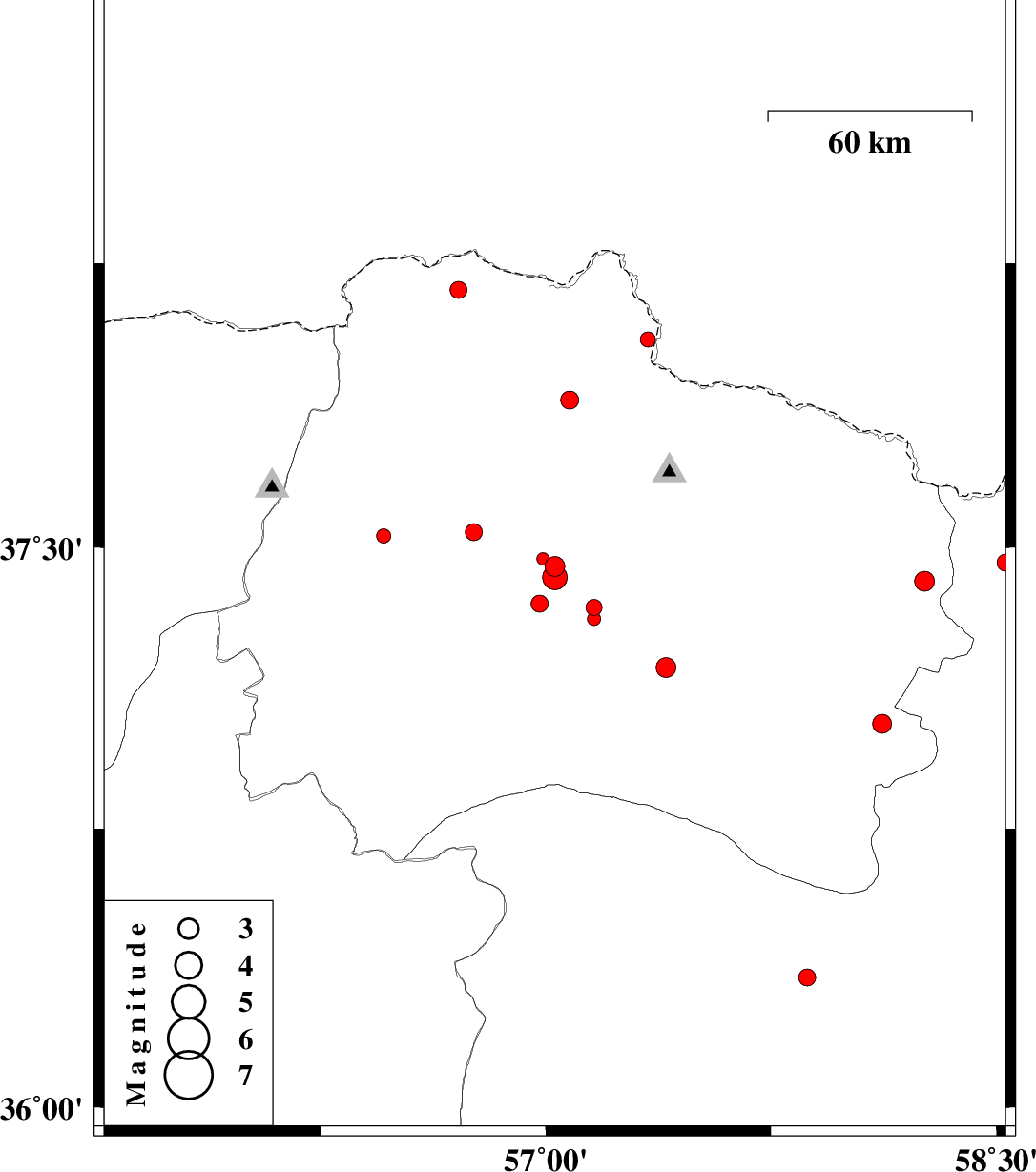 | 2012/03/20 | 08:31:50.0 | 12:01:50.0 | 38.05 | 57.34 | 7 | ML2.2 | Khorasan(north) Province, 64 km North of Bojnurd |