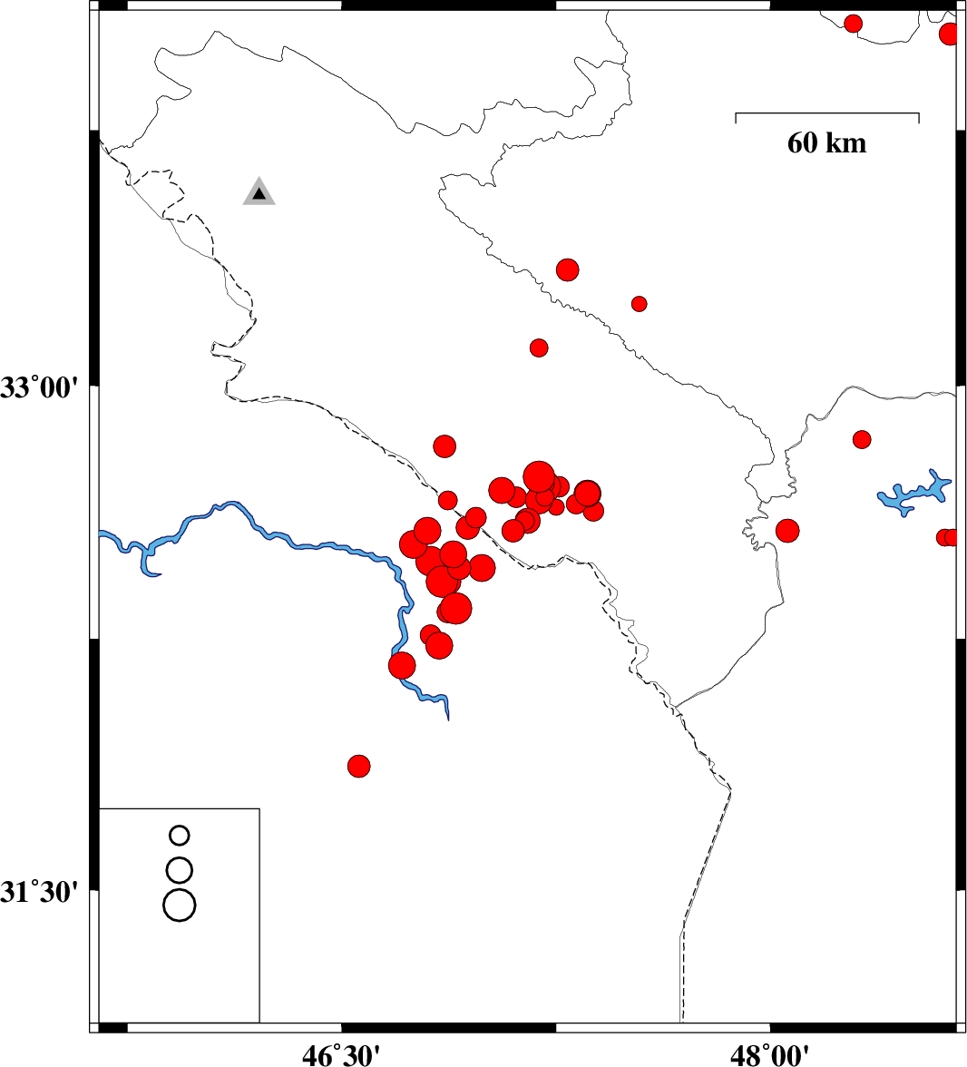| 2012/04/20 | 15:37:02.8 | 20:07:02.8 | 32.42 | 46.85 | 18 | ML5 | Iraq, 49 km South-West of Dehloran | ||