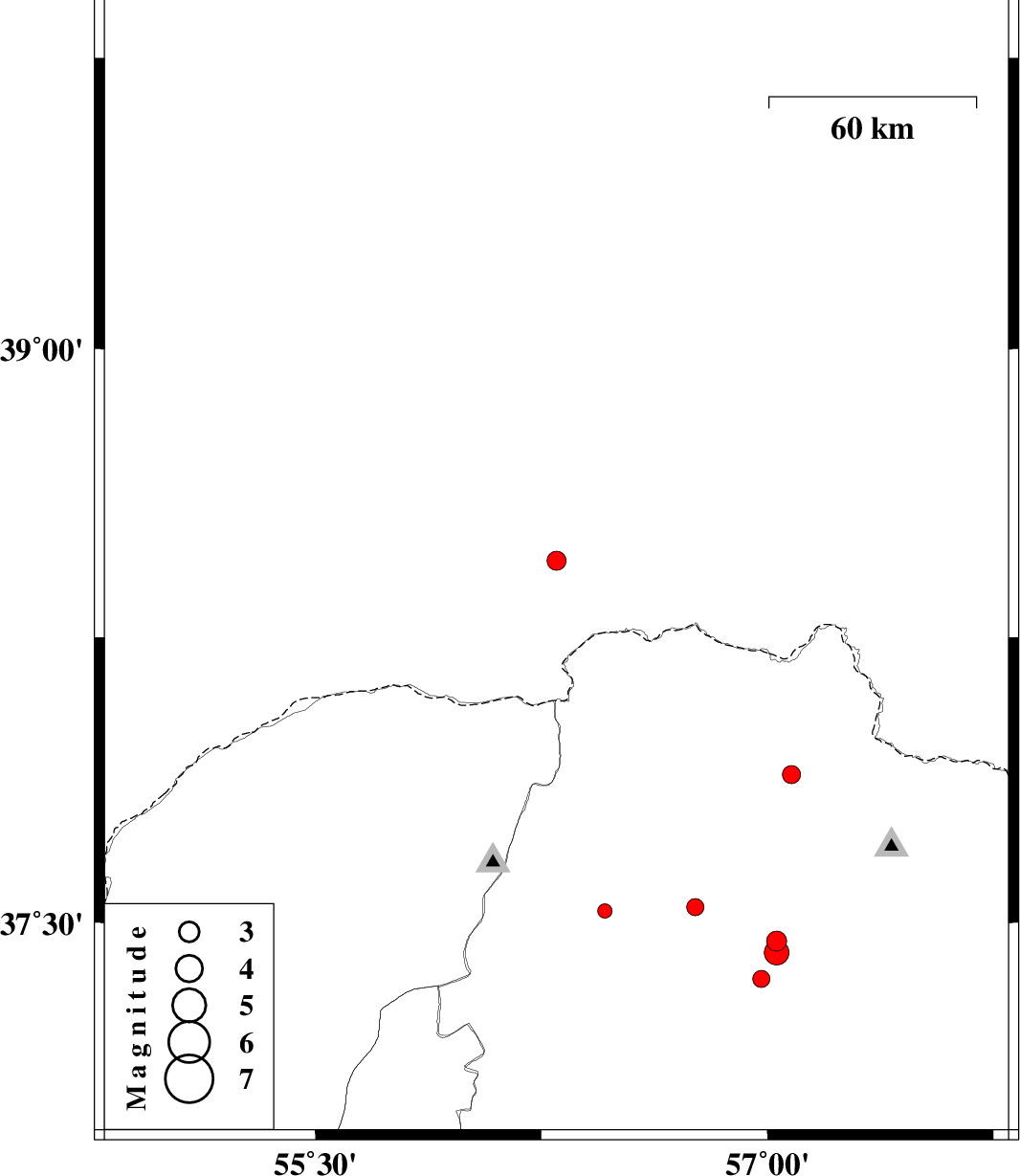 | 2012/04/15 | 09:02:20.3 | 13:32:20.3 | 37.35 | 56.98 | 46 | ML2.5 | Khorasan(north) Province, 22 km South of Ashkhaneh |