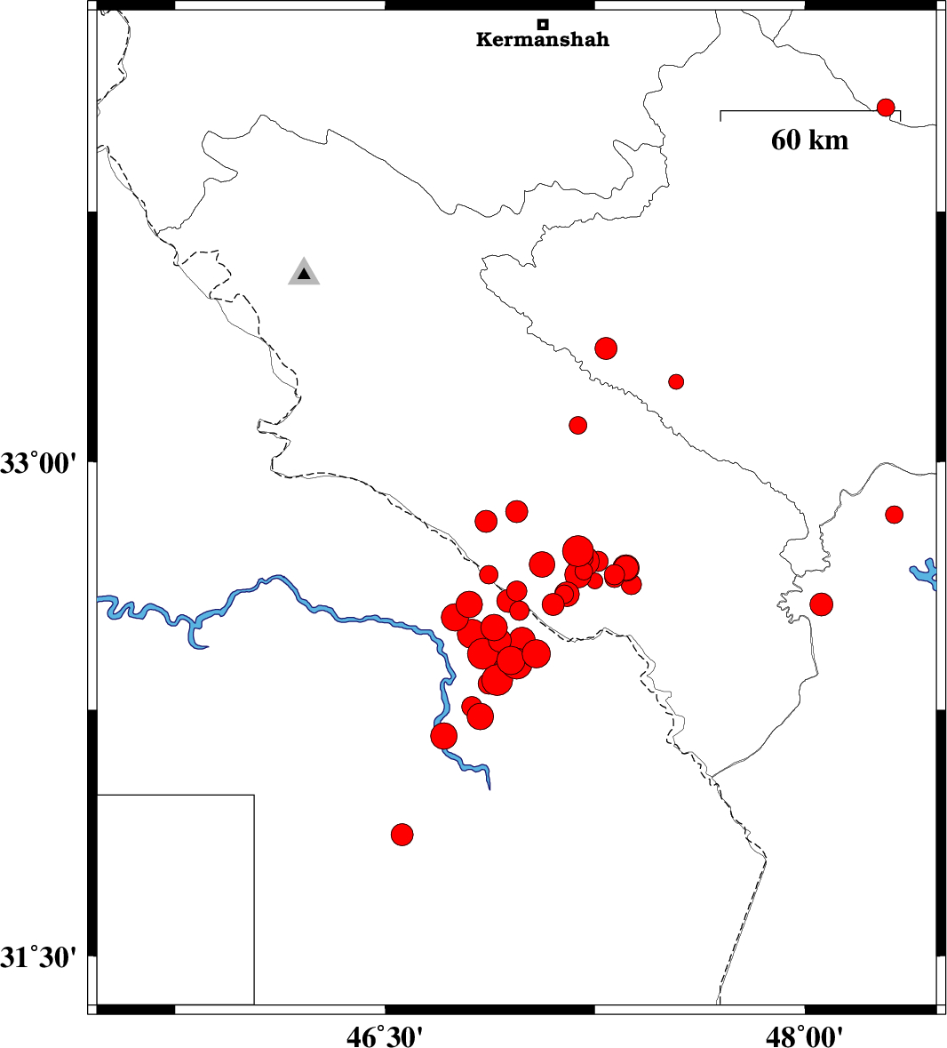 | 2012/04/20 | 01:48:42.9 | 06:18:42.9 | 32.6 | 47.15 | 33 | ML4 | Ilam Province, 15 km West of Dehloran | ||
