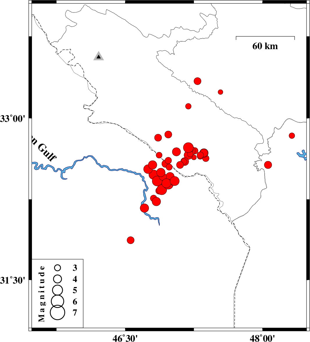 | 2012/04/19 | 06:27:05.9 | 10:57:05.9 | 32.33 | 46.87 | 40 | ML3.4 | Iraq, 54 km South-West of Dehloran | ||